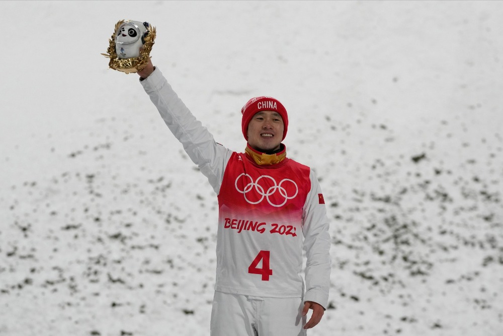 【自由滑雪男子空中技巧 中國隊奪金】北京冬奧會自由式滑雪項目在張家口賽區雲頂滑雪公園上演空中技巧男子組決賽。在決賽第2輪,中國選手齊廣璞做出完美動作,以129分獲得金牌,四次征戰冬奧會終於如願奪金,16年的堅守終於圓夢。齊廣璞的這面金牌也是中國代表團在今屆冬奧會的第7金。