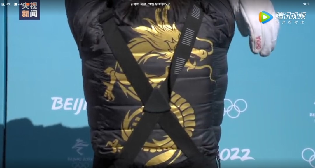 日前在女子自由式滑雪U型場地技巧賽的預賽中,谷愛凌比賽期間穿着的運動服中,隱約能看到一條金龍!在賽後訪問中,谷愛凌表示比賽服與雪板都是自己設計的,比賽的運動服後面有金色的中國龍,雪板上也是一條中國龍,翻過來還有英文寫的「人中之龍」,她希望透過在比賽中展示,讓更多人看到中國文化。