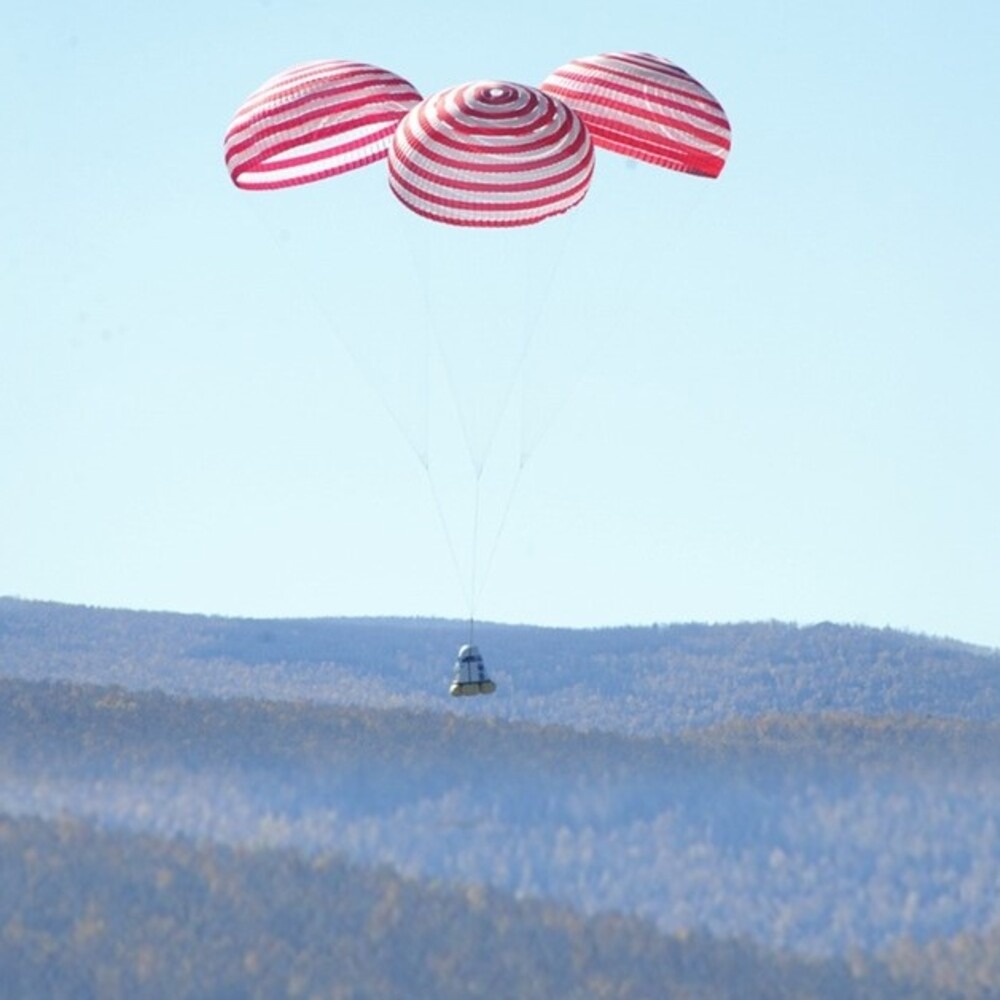 這時返回艙速度稍為降到大約每秒180米,減速傘隨即與返回艙分離,同時拉出一具巨型主傘,把返回艙速度逐步降至每秒7至8米(相當於時速20多公里)。