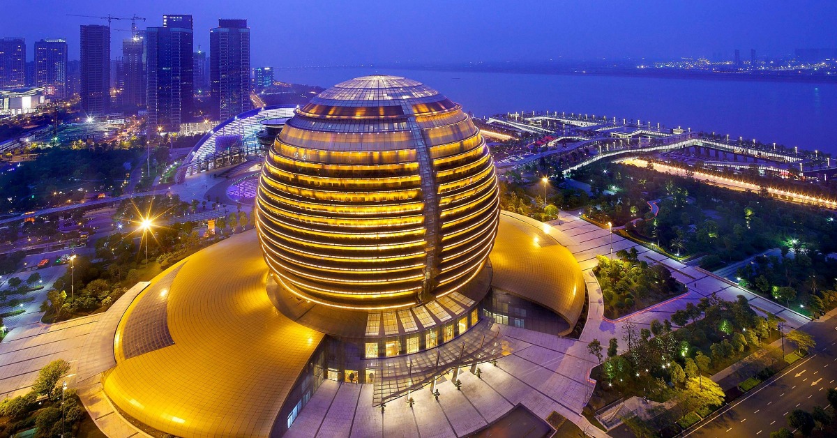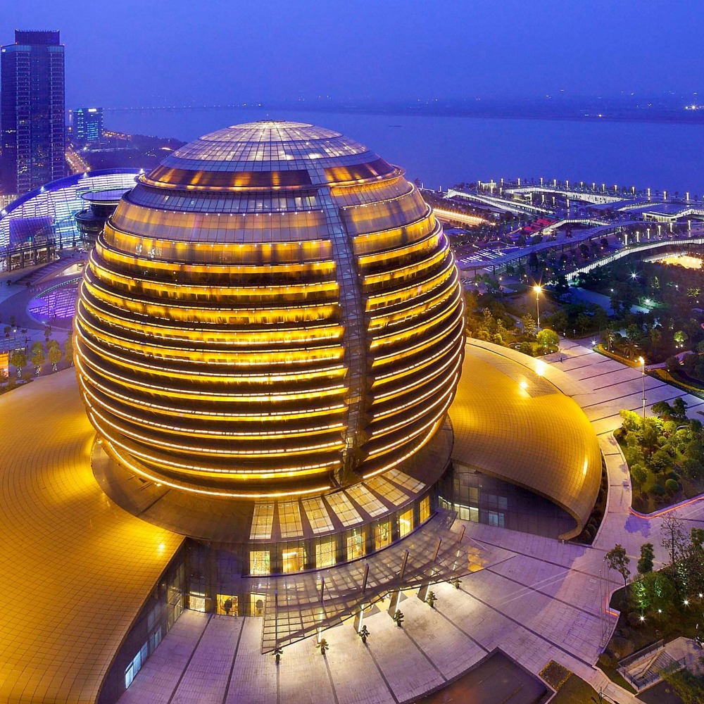杭州洲際酒店「金球」外形 與「月牙」杭州大劇院相呼應