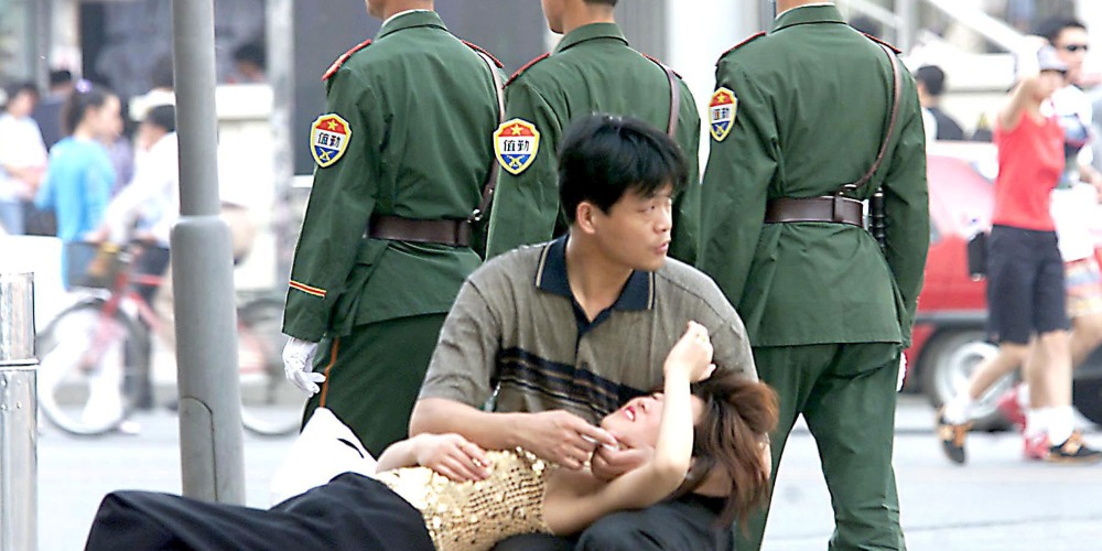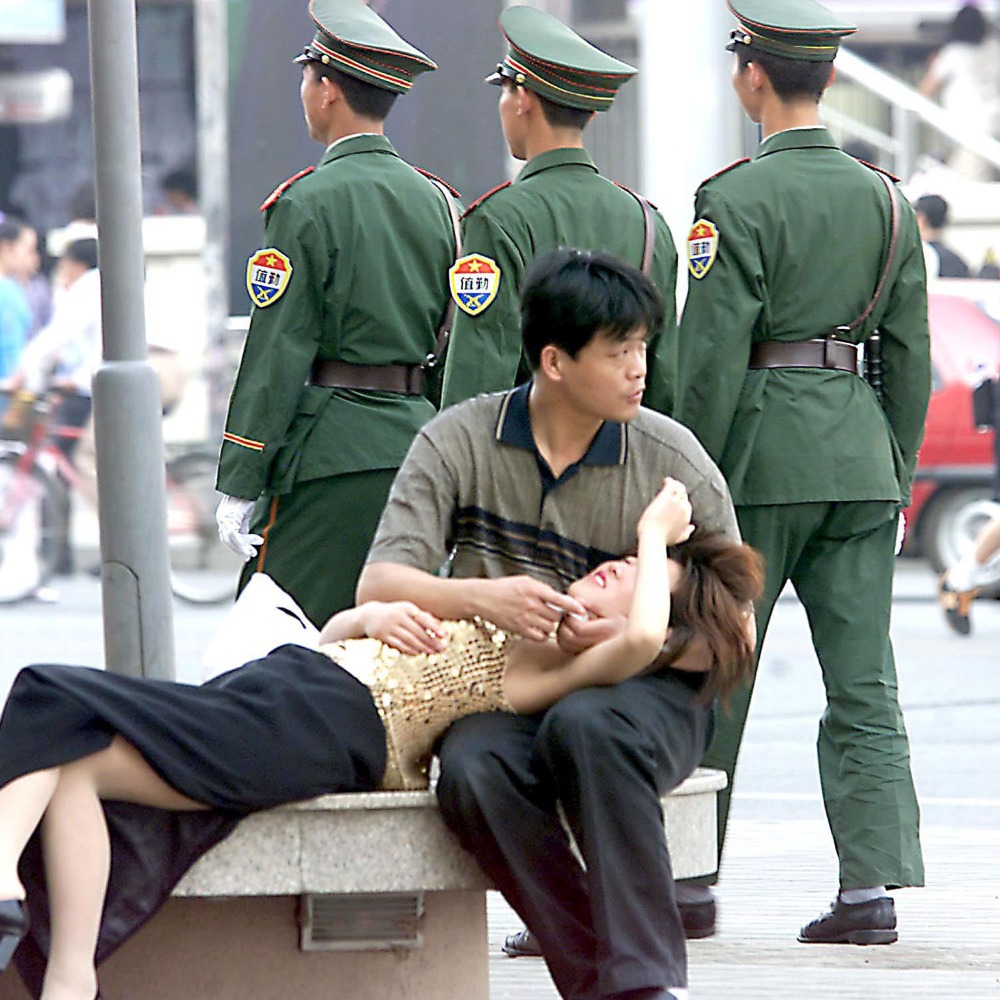 這幀千禧年代的街頭快拍,是時代寫照,穿着性感的女子在北京街頭旁若無人依躺在男方大腿,大膽之舉與身後武警形成鮮明對比。