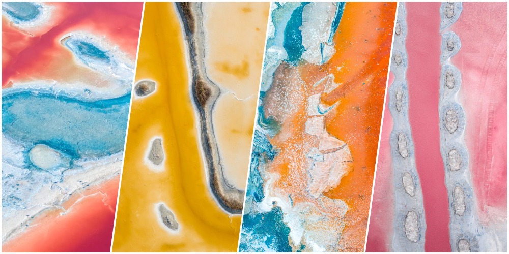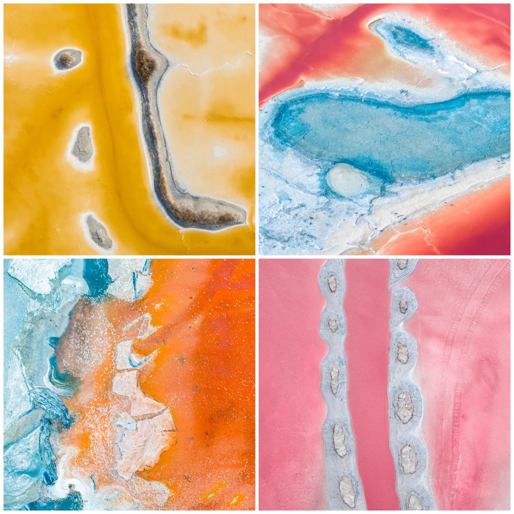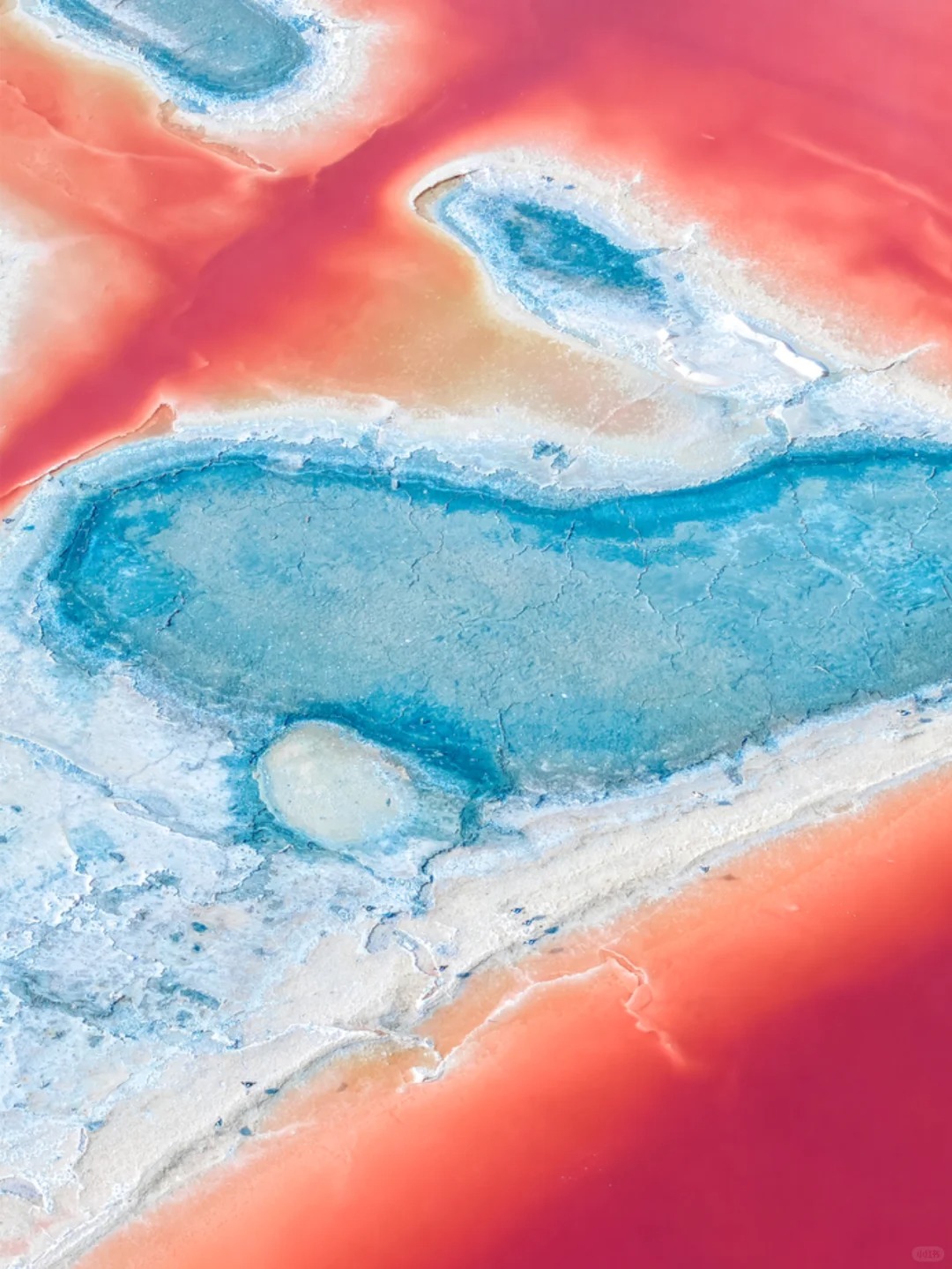 形狀不規則的鹽湖散落在廣闊的大地上,有些圓圓的、有些橢圓形的,還有些方方正正的,而湖水有的是紅色、粉紅色、紫紅色、淡綠色及褐綠色,在航拍鏡頭下,宛如調色盤上的水彩,非常特別。