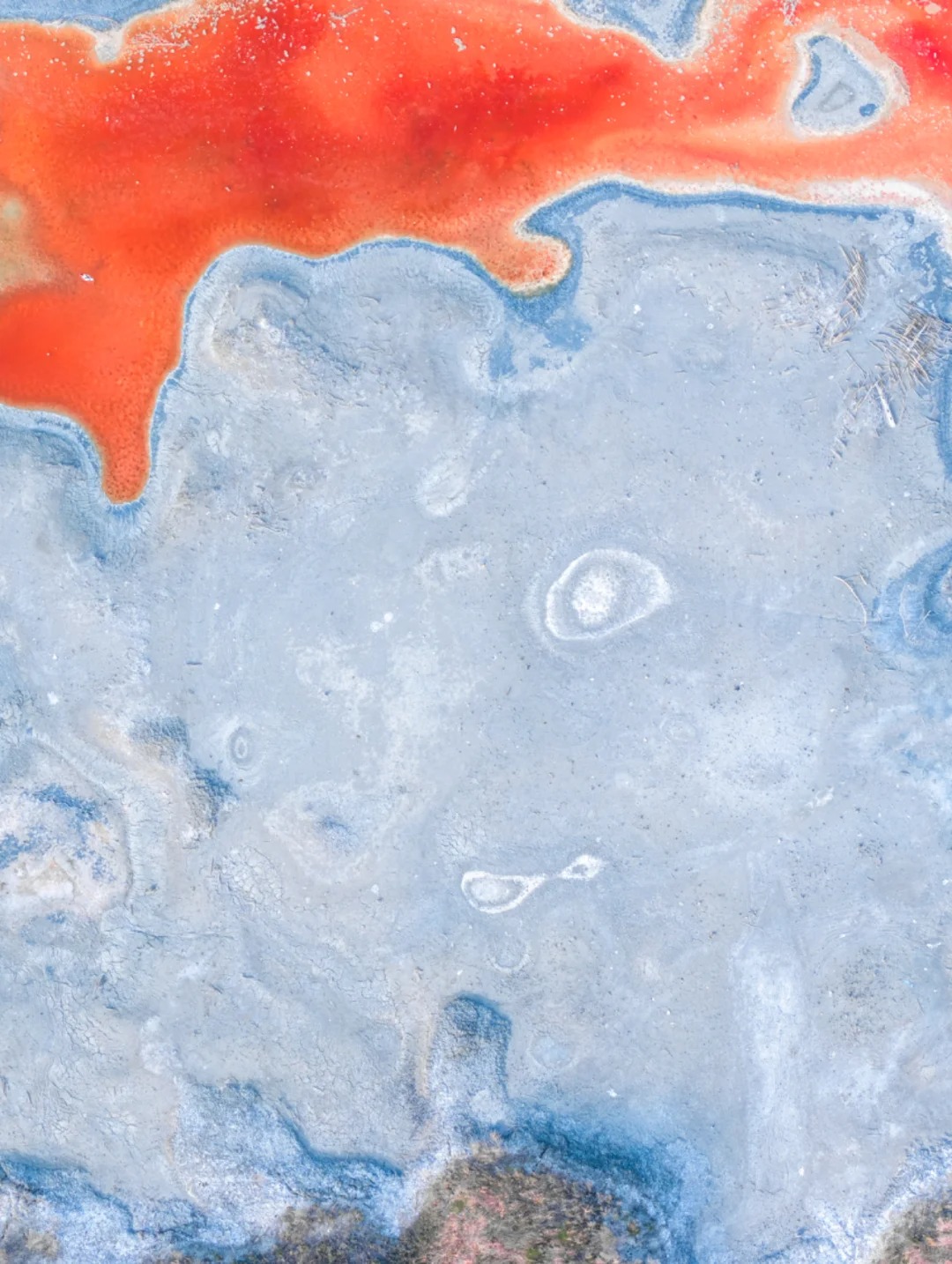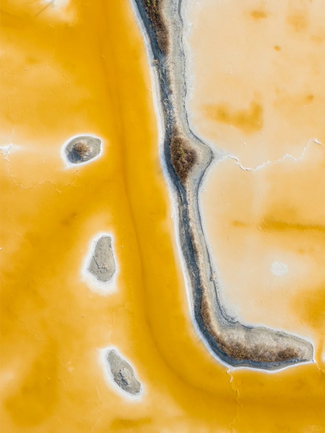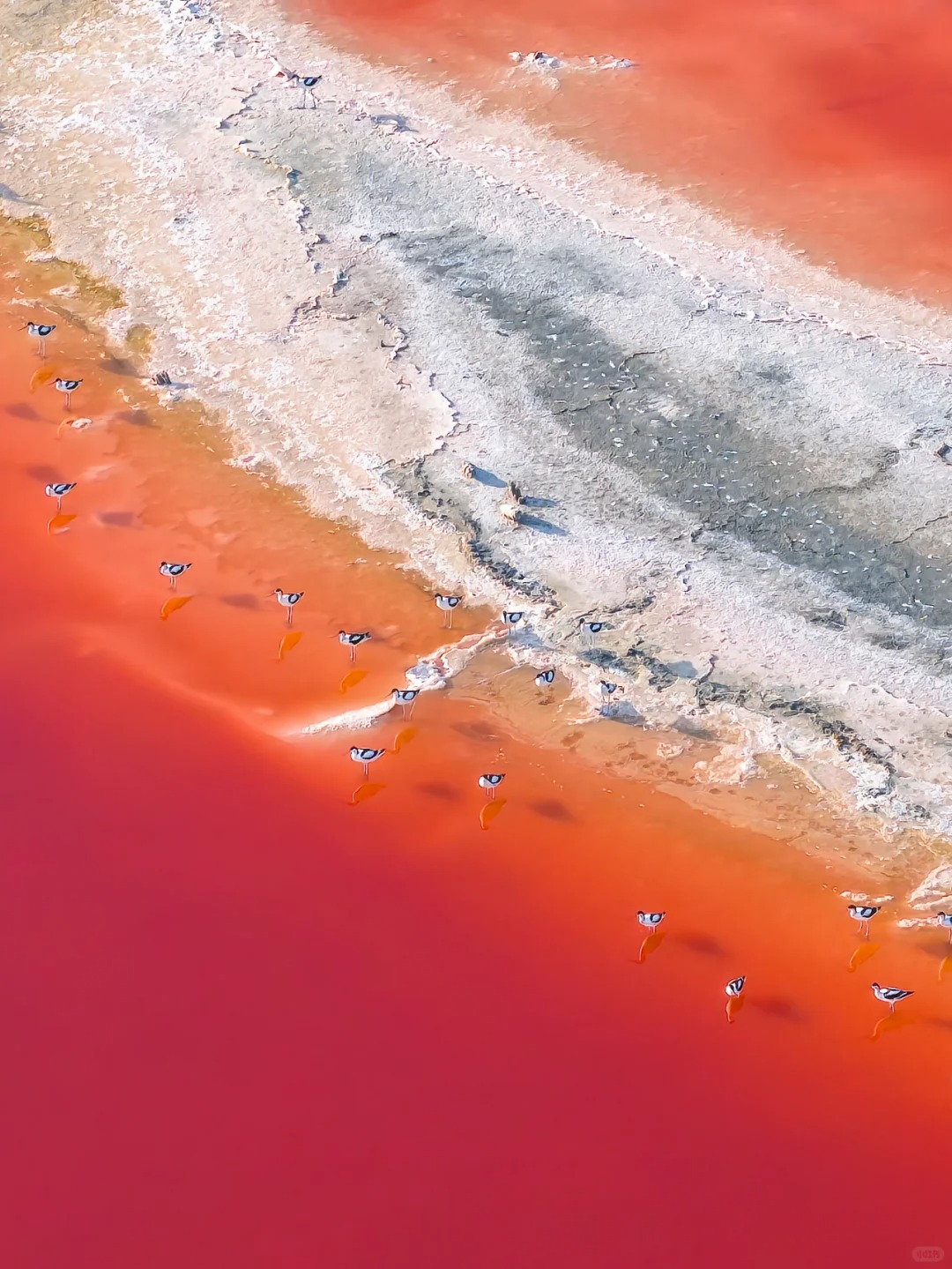 形狀不規則的鹽湖散落在廣闊的大地上,有些圓圓的、有些橢圓形的,還有些方方正正的,而湖水有的是紅色、粉紅色、紫紅色、淡綠色及褐綠色,在航拍鏡頭下,宛如調色盤上的水彩,非常特別。