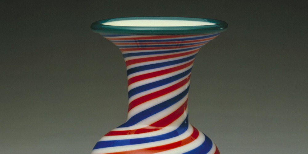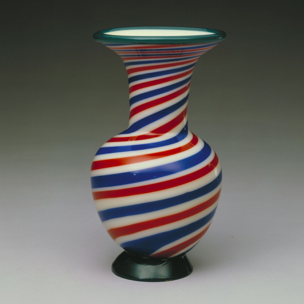 此瓶為喇叭狀圓口,口沿外撇,頸直且較長,闊腹下斂,類鵝卵形,高圈足,底部外撇。足底陰刻楷書「乾隆年制」四字款。瓶口和足部套碧綠色玻璃,頸、腹部飾白、藍、紅三色相間的條帶紋,通體螺旋纏繞,其顏色的相間規律為白、紅、白、藍。
