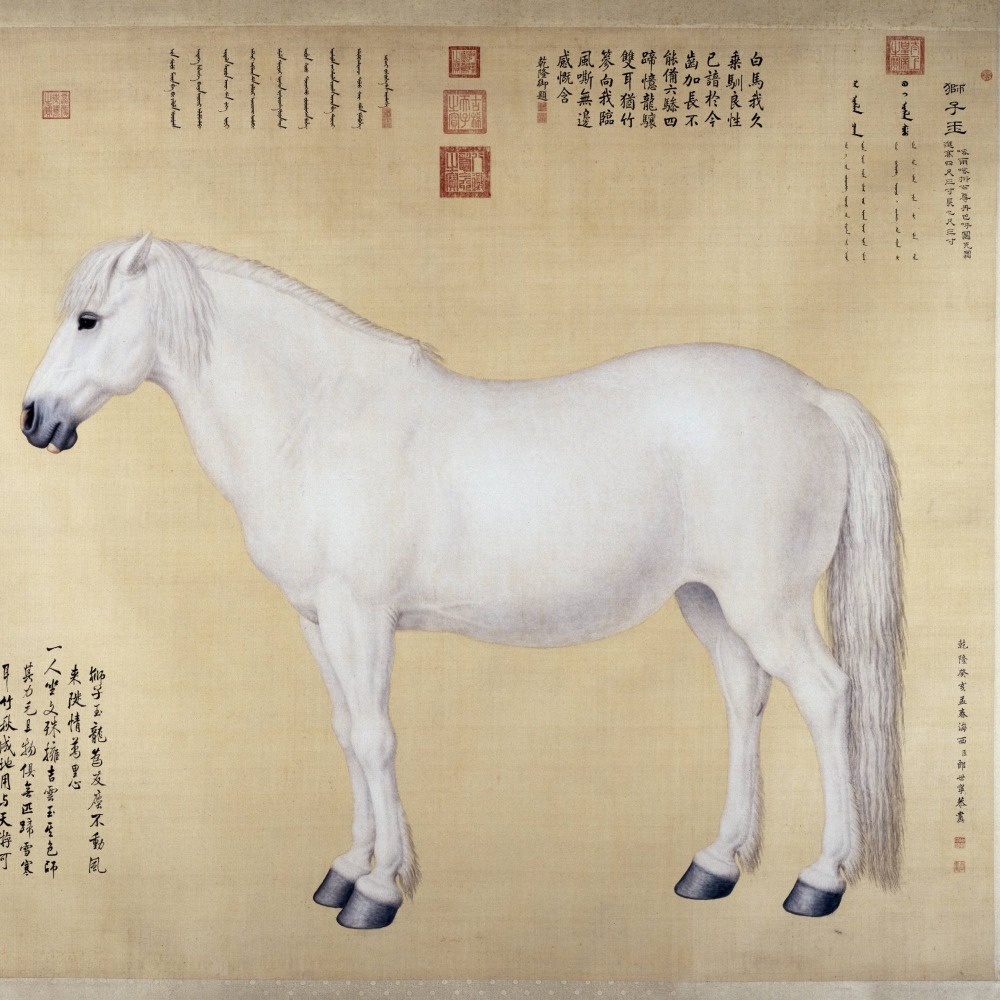 此馬名為「獅子玉」,為乾隆帝的十駿之一,是藏傳佛教格魯派活佛進獻的貢品。尊崇格魯派是清廷管治蒙古及藏區的重要策略。