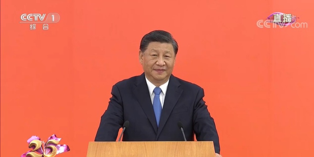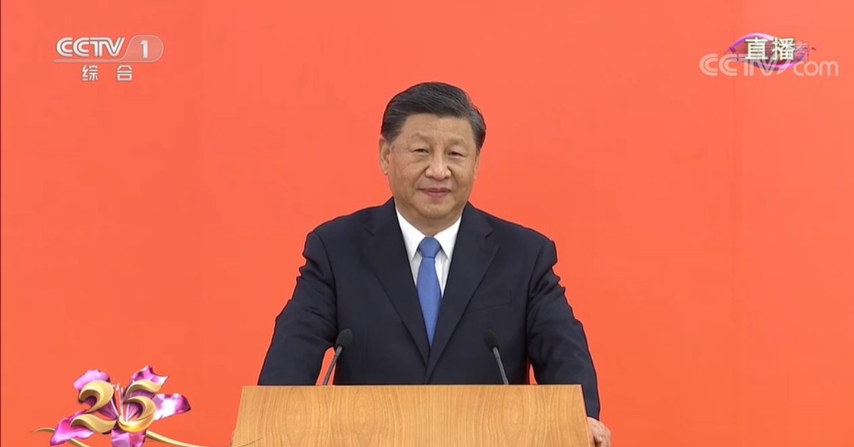習近平主席發表簡短講話表示,在香港回歸25周年之際,再次來到香港,感到十分高興。習主席表示,明天是香港回歸祖國25周年慶典日,全國各族人民都將和香港同胞一道,慶祝這件喜事。在此,他向香港同胞致以熱烈祝賀和美好祝願。