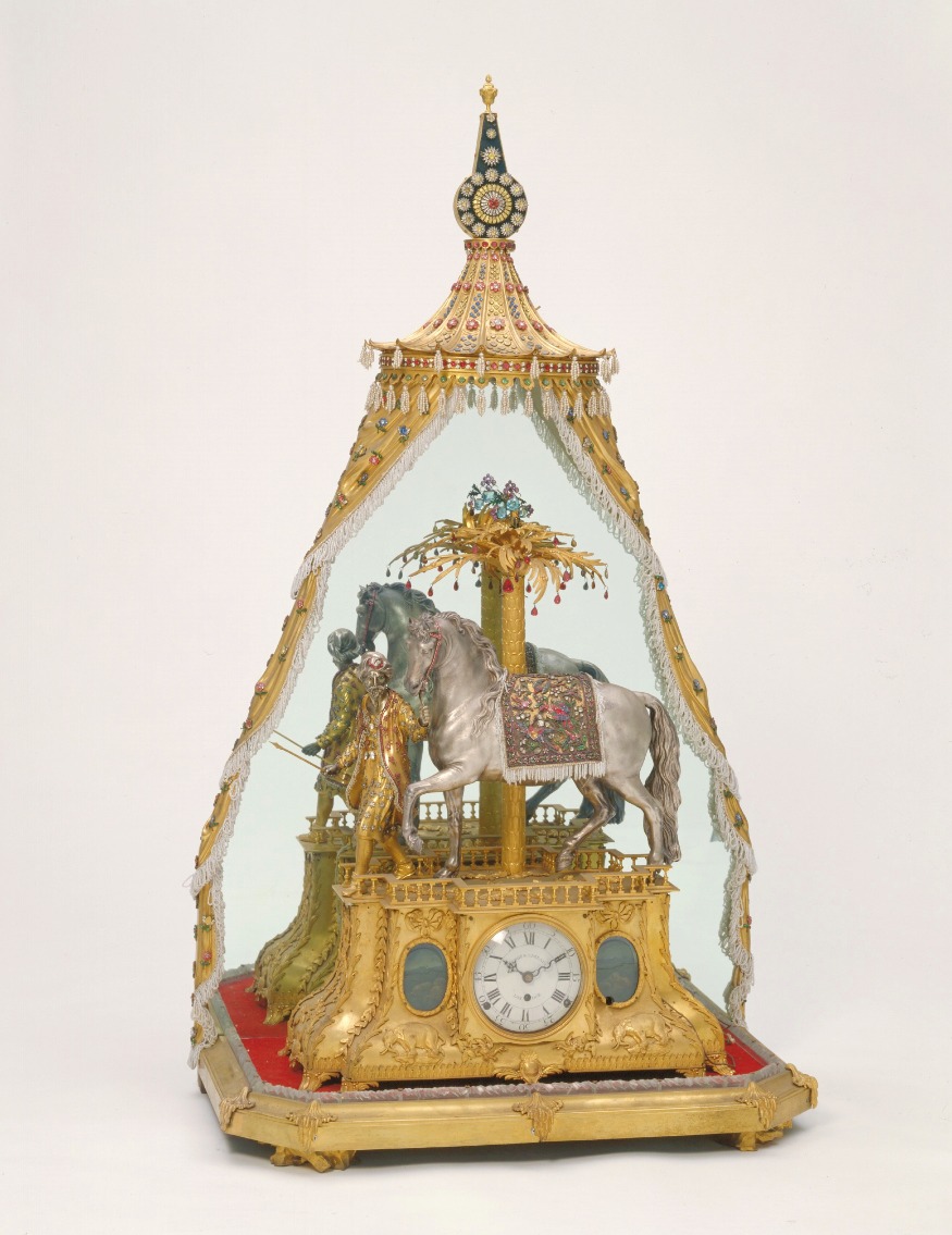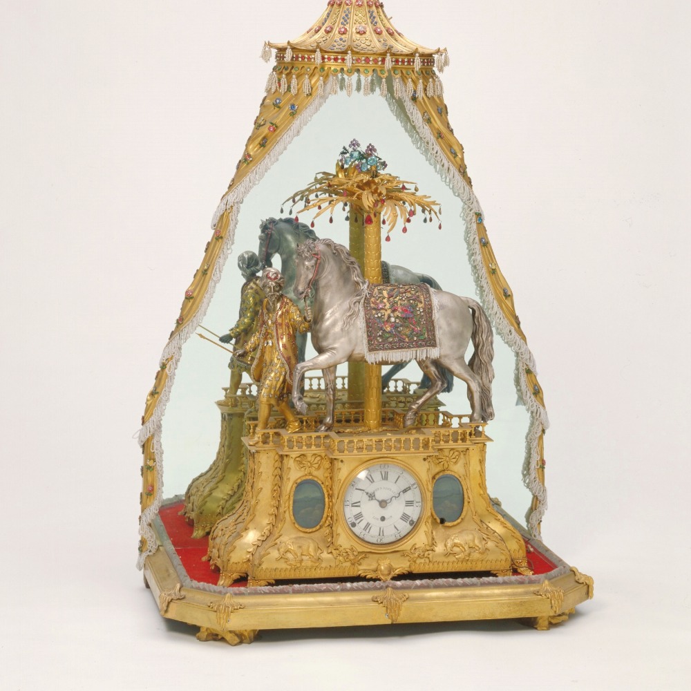 座箱上面的平台上,有一棵棕櫚樹,樹下一名騎士手牽銀質駿馬,馬佩戴五彩料石轡。人、馬造型及神態,都生動傳神,好似在行進的途中。