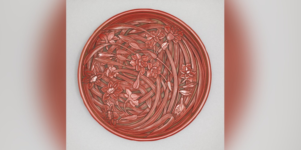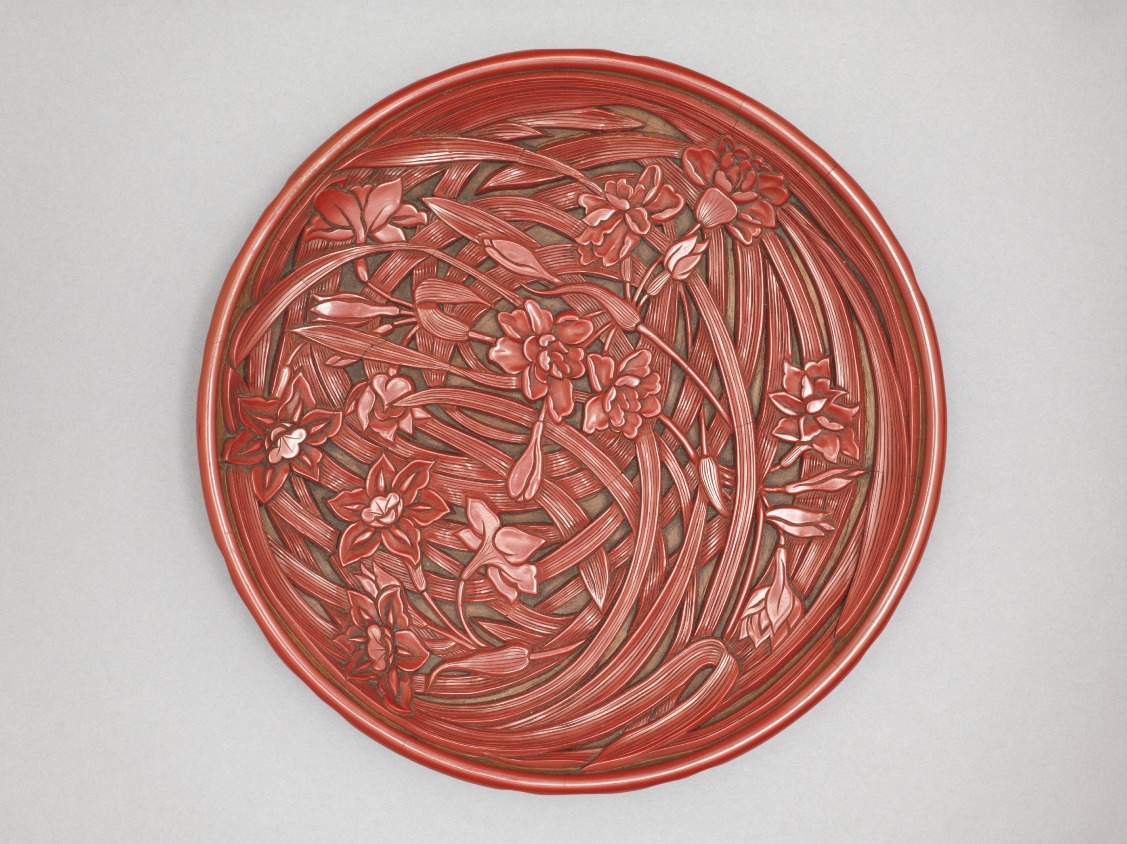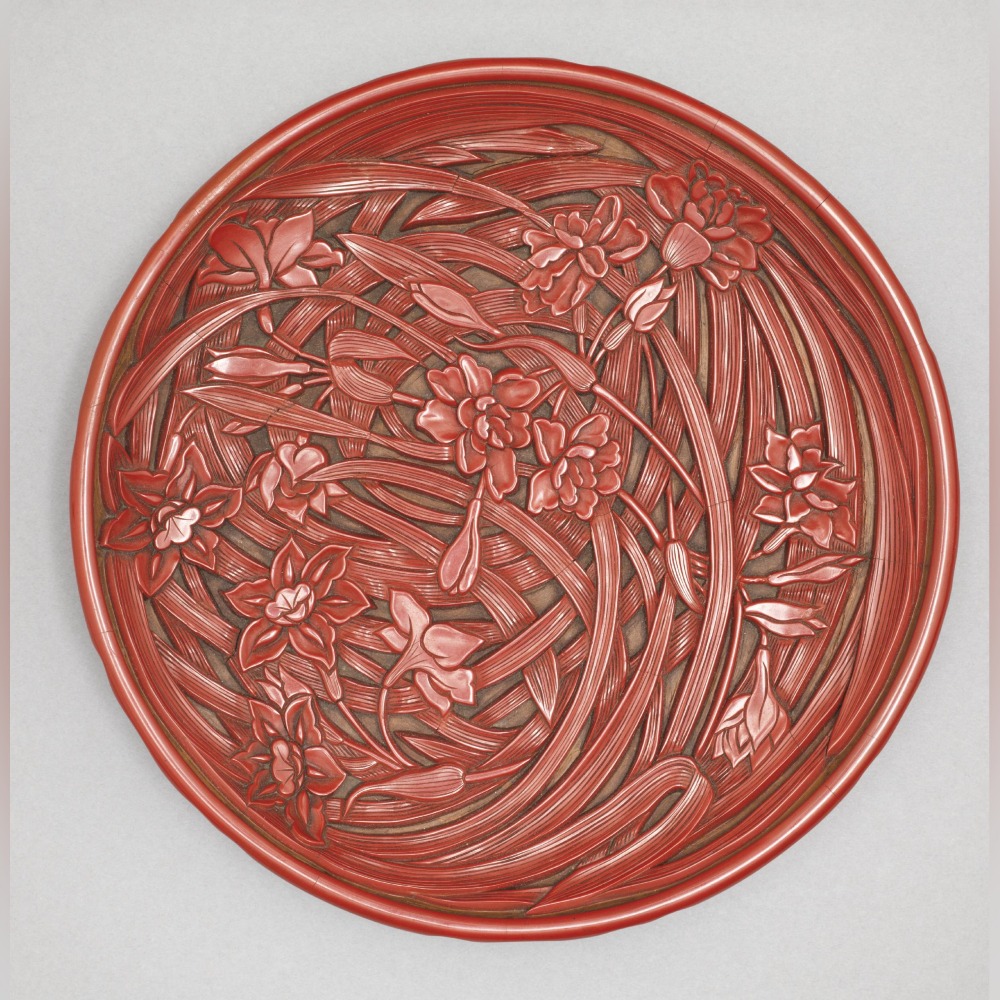 水仙花一般開花於冬末春初,文人喜好它素雅的色調和白、黃色的花瓣,常常投射為湘夫人和洛神等形象。以水仙為主題的漆器,兼具華麗和淡雅的風格。此器雖有乾隆款,但學者認為是後世所加,應為元明遺物。