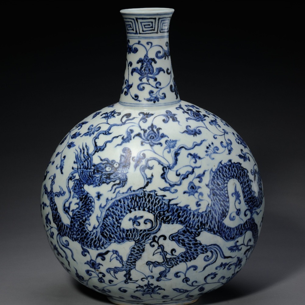 這件扁壺的外形仿照中東地區的器皿,瓶身以中東進口的鈷料「蘇麻離青」繪就,發色濃艷。龍的形像矯健生動,穿梭在纏枝花之間。