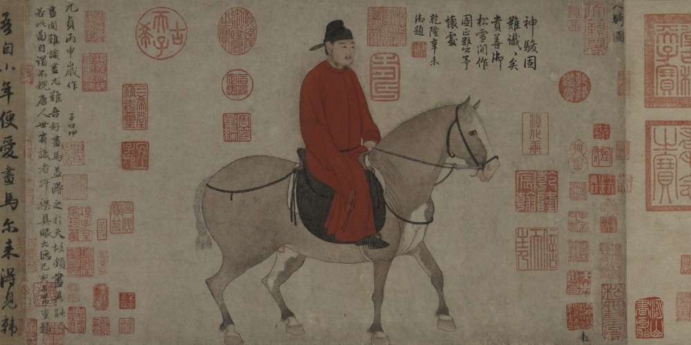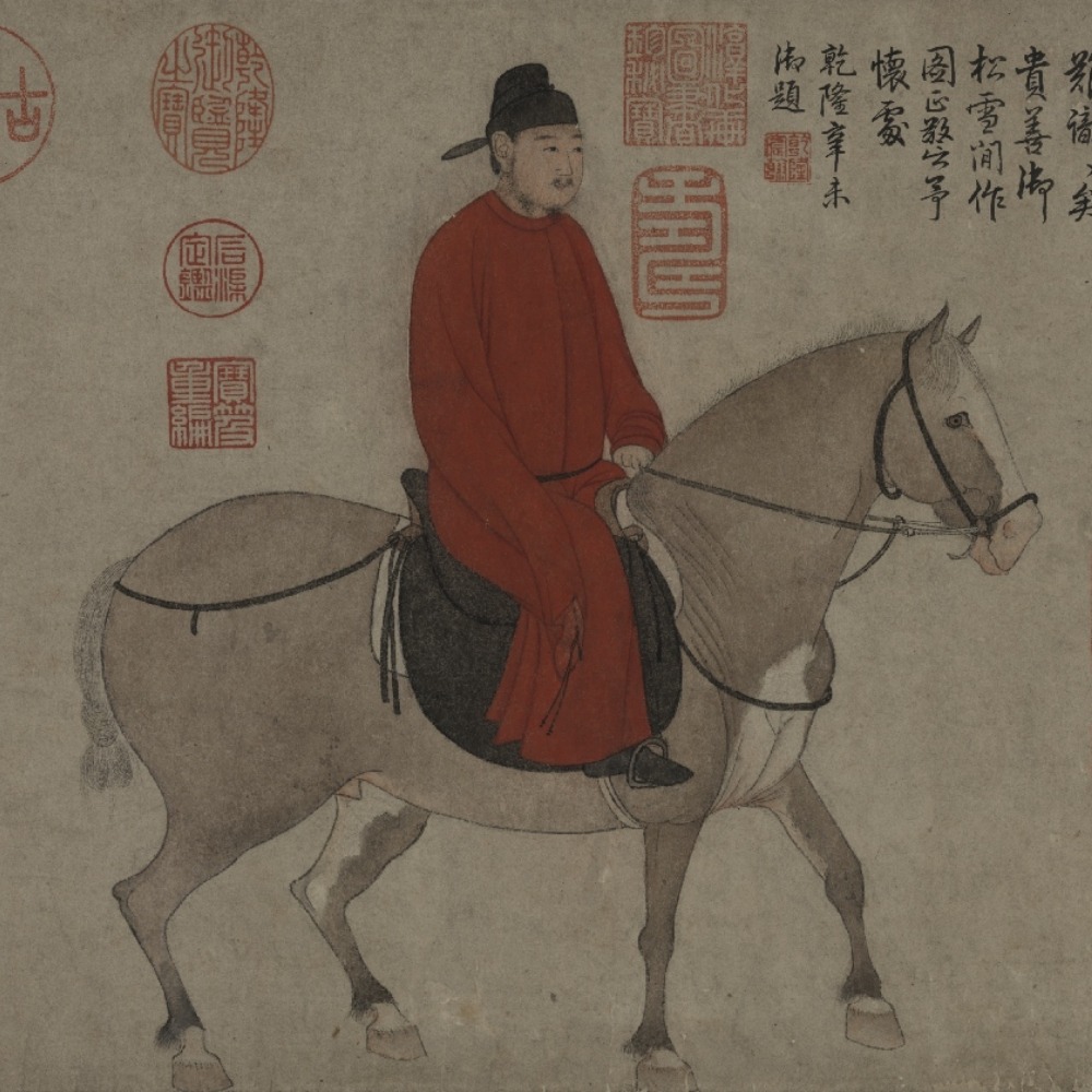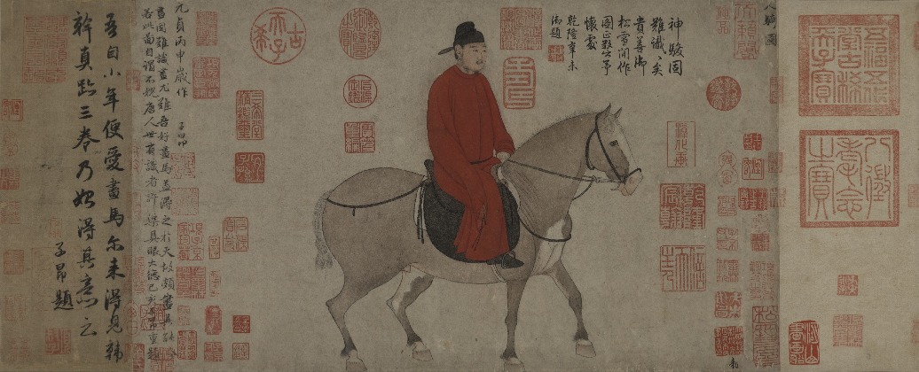 這幅畫繪有一名戴官帽、腰系玉帶的紅袍青年男子騎於馬背之上,男子微有髭須,左手牽韁,右手持鞭,右腳輕踩馬鐙,神態優雅自足。馬匹孔健有力,左前蹄微起,呈行進之勢。畫面布局、人物形像和馬匹寫實畫法,都深受唐代畫馬圖影響。