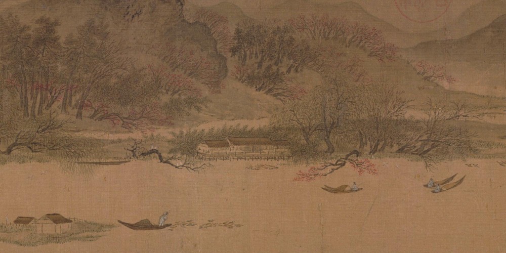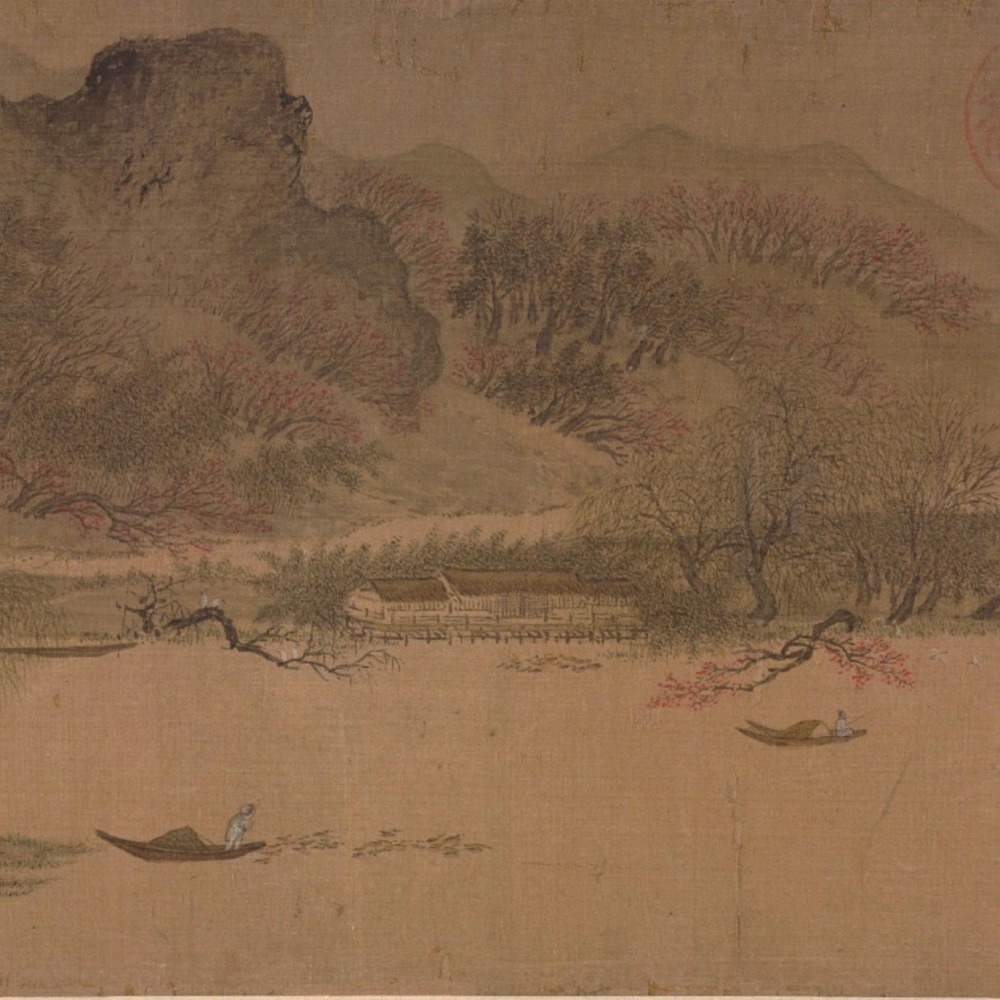 本品描繪明麗的春景,畫面呈平遠之勢,遠山綿延,平渚相牽,漁舟散佈,禽鳥和鳴。山巒間嵐氣縈繞,坡岸上柳暗花明,一派遠離塵囂、清曠渺遠的江南春色,令人遙想陶潛筆下的武陵源。