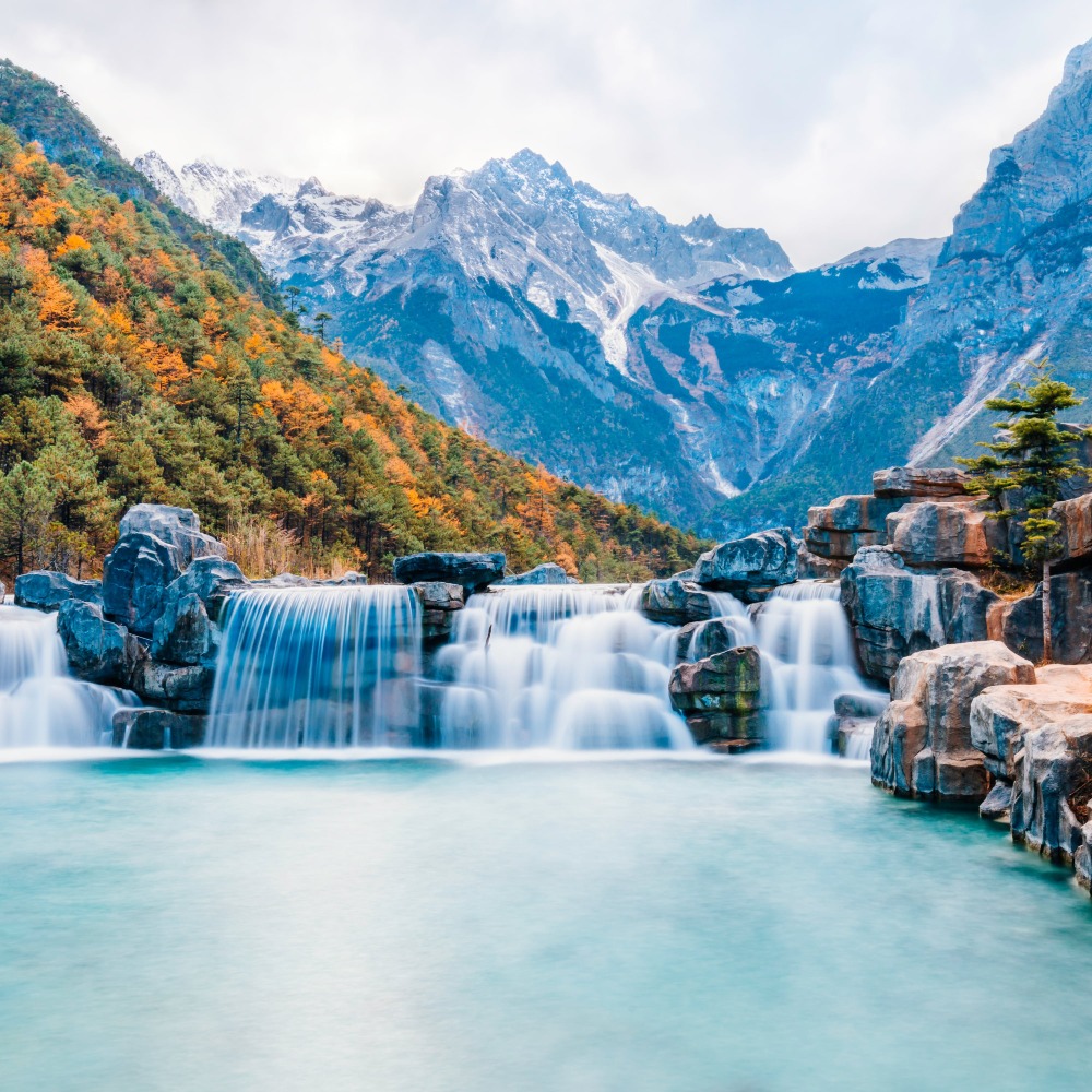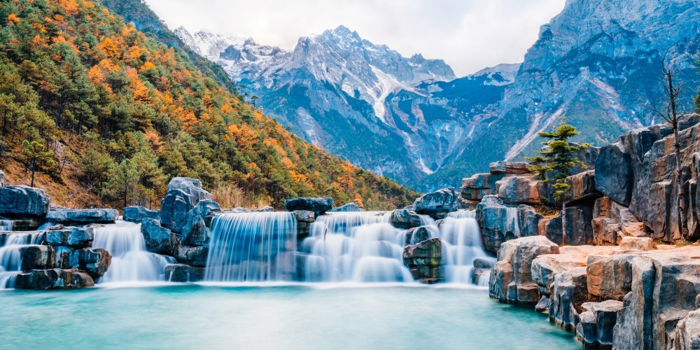 藍月谷風景區位於玉龍雪山中部山腳,積雪融化成河水後,順山谷而下,經過階梯般的白水台,再往下匯聚成湛藍的玉液湖。