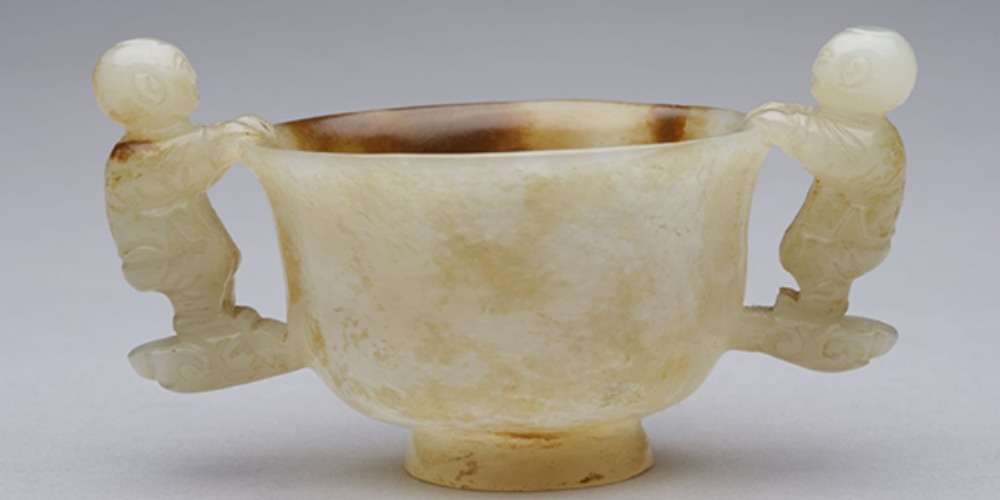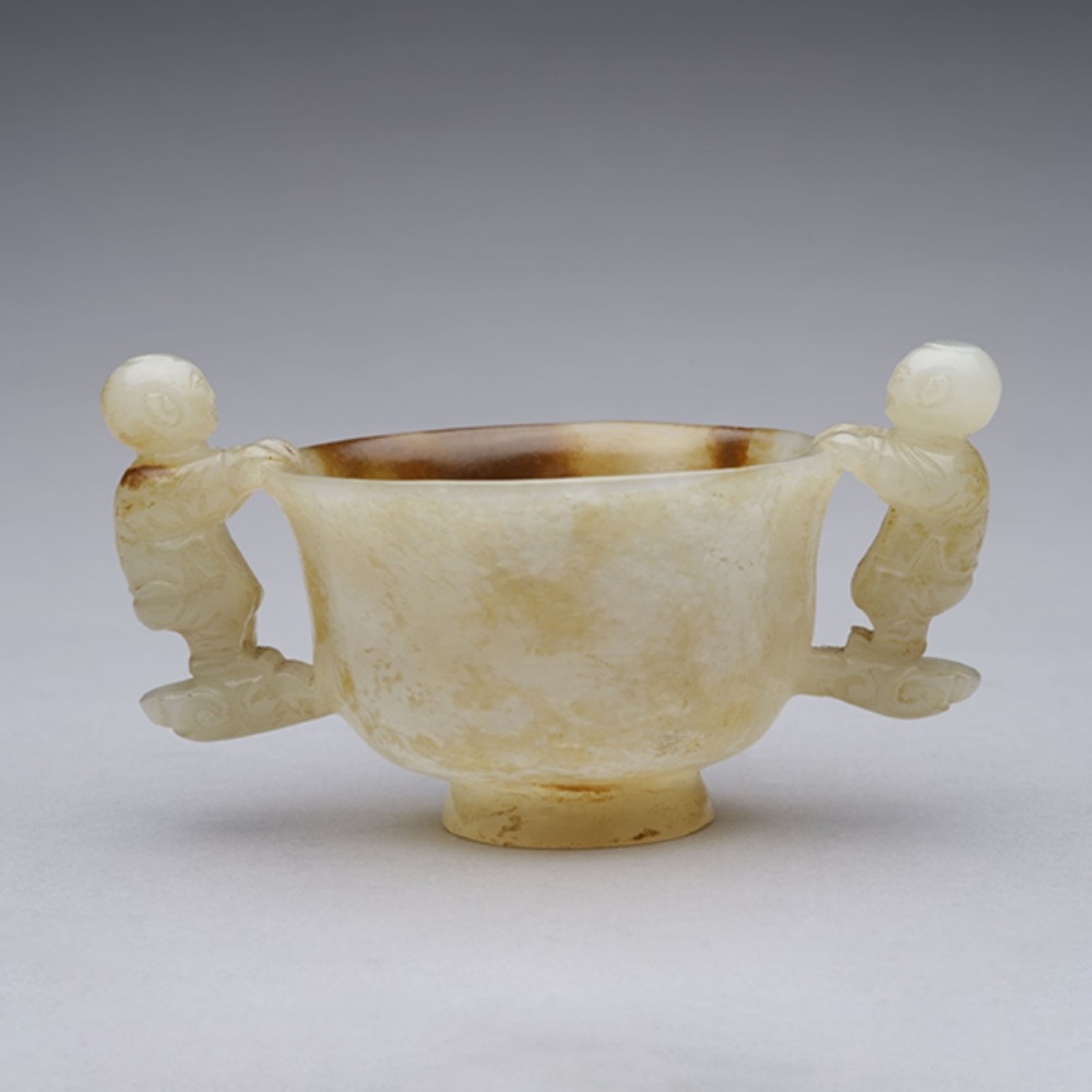 雙嬰耳杯,在宋代的銀器造型中就出現過,此後成為一種固定的題材。 在清代玉器中就發現多件,不過大都為清中期以後的作品。根據《玉杯記》的記載,這件耳杯製於清初。