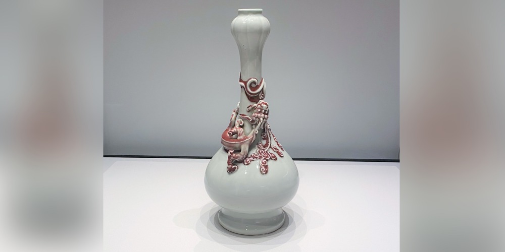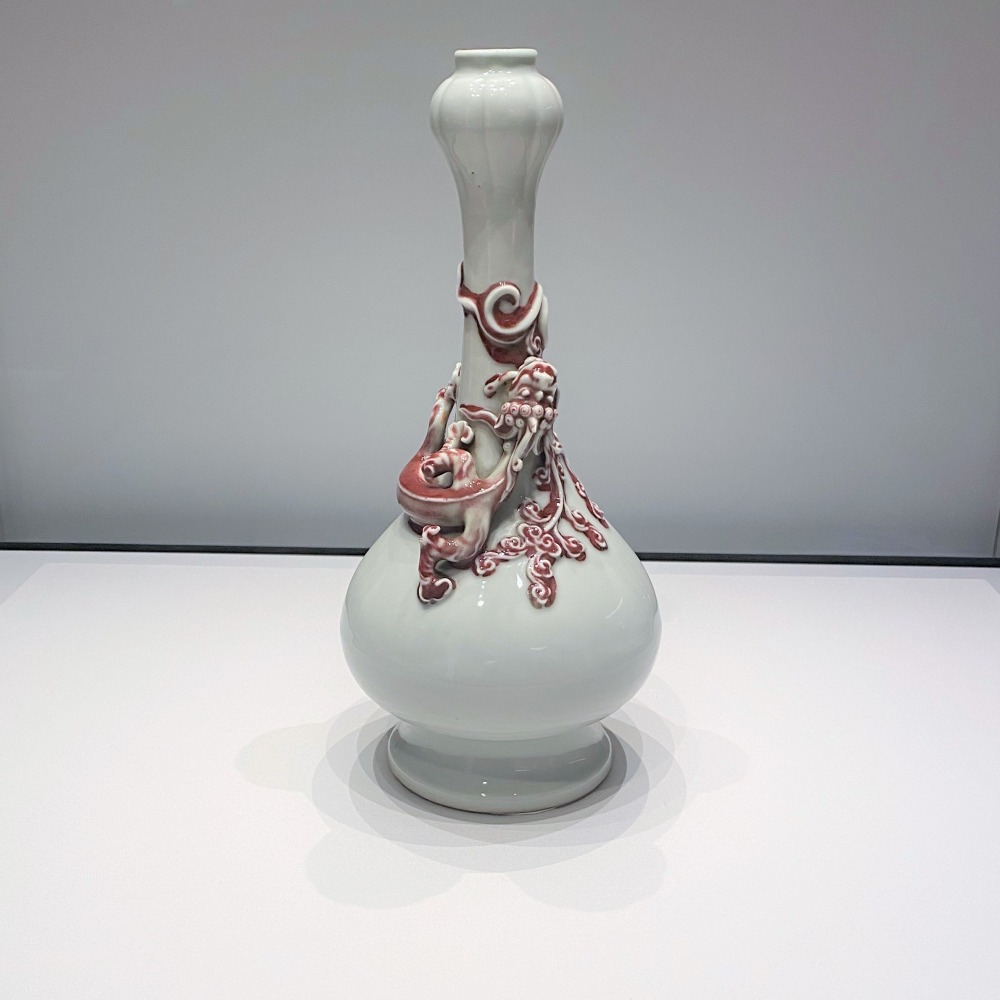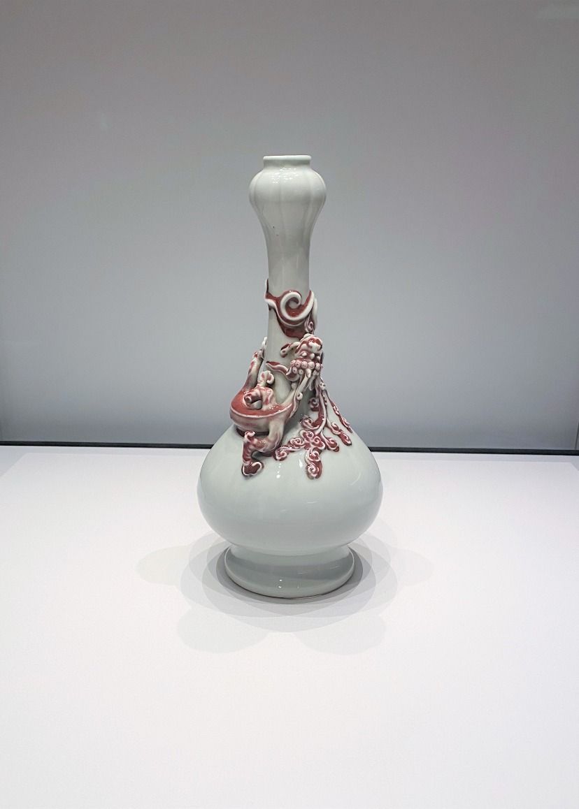 白釉塑貼鮮紅釉蟠螭蒜頭瓶