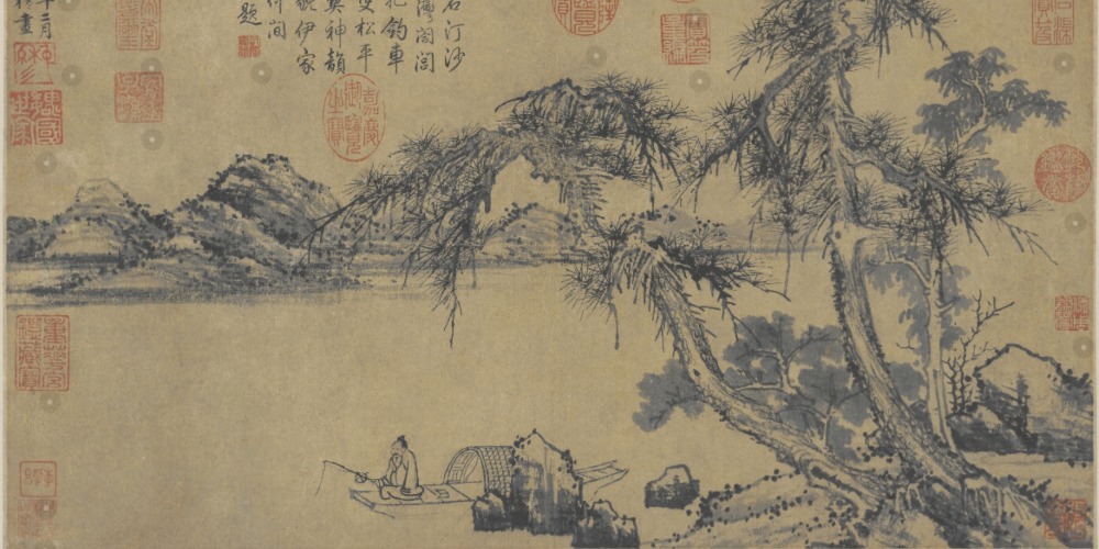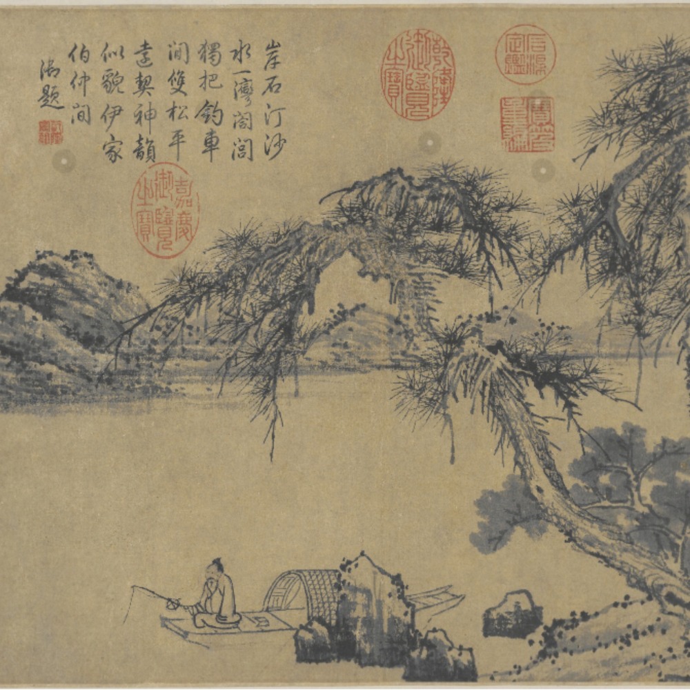 其三為松溪放艇圖,元代朱德潤所作。圖繪巨石怪松,孤舟徐行。畫松枝用筆爽利迅捷,坡石皴法溫潤,人物用白描法,筆簡意濃。畫中自題:「醜石半蹲山下虎,長松倒臥水中龍。試君眼力知多少,數到雲峰第幾重。」
