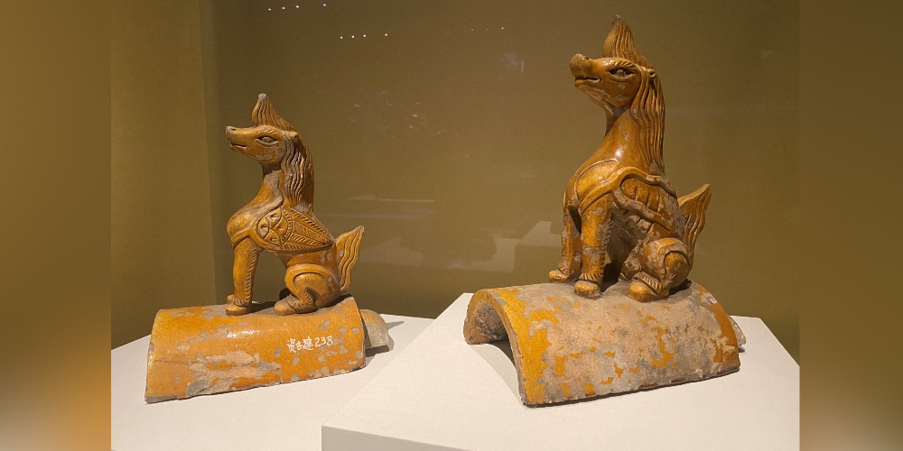 展櫃中的琉璃構件是二次燒成的低溫黃鉛釉陶,陶胎經晾曬、粉碎、陳腐、練泥、成型後,用煤炭作高溫素燒,施鉛釉後再用柴火低溫釉燒而成,堅固防水。低溫鉛釉以鉛的化合物作為基本助熔劑,特點是釉面光澤強,釉層清透,表面光滑平整,如玻璃一樣。