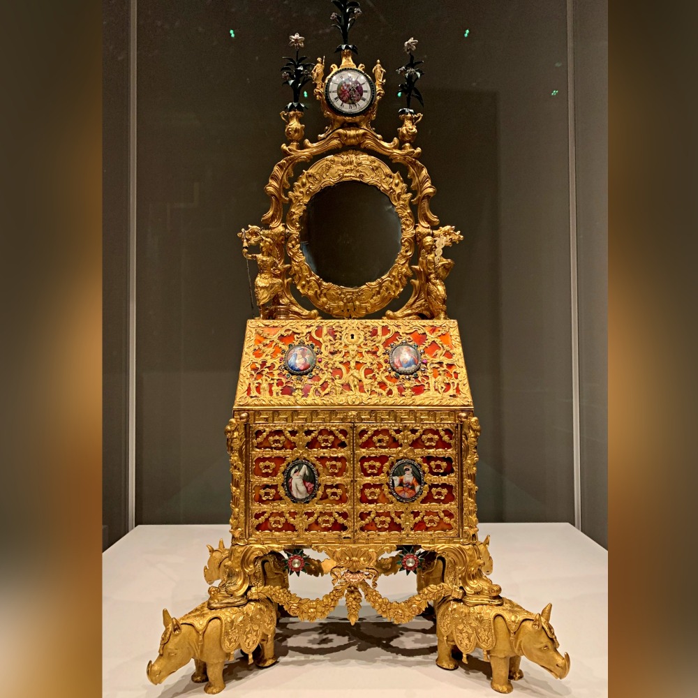 規矩箱頂端鑄兩個手持武器的威武士兵。容鏡固定在規矩箱上方,可調整仰俯角度,鏡邊緣包裹卷草葉。表在最頂端,其時、分針上均嵌白色料石。錶盤中心有一琺瑯片,描繪一男子向女士求愛。表上方置一束瓶花。