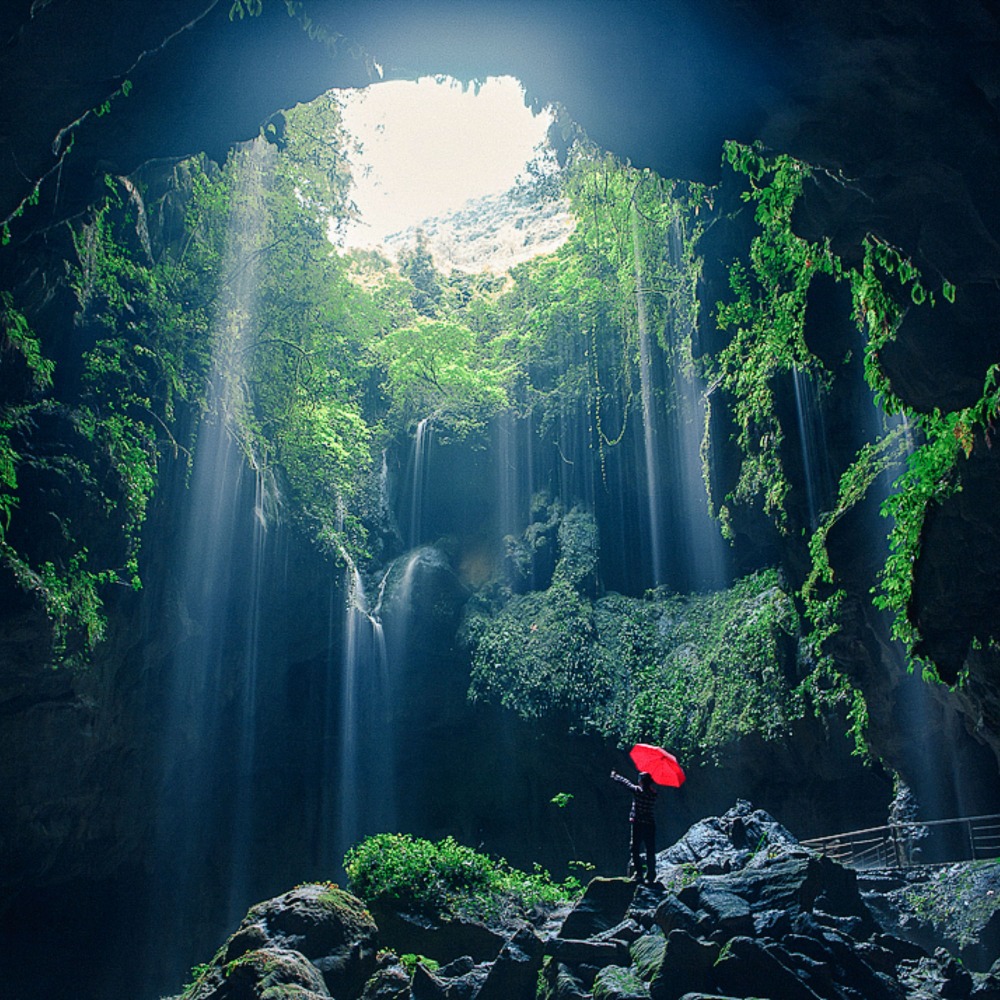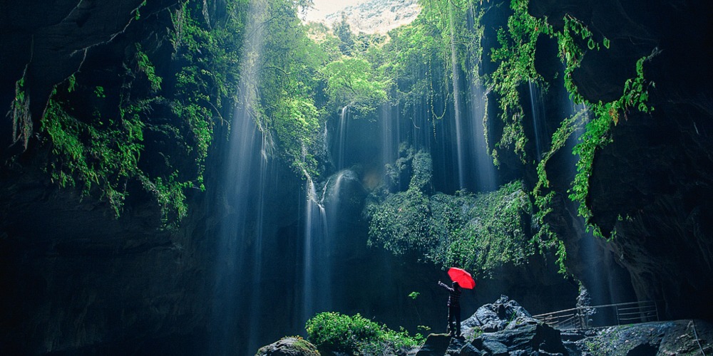 每逢下雨的時候,水流便會從天坑坑口直瀉而下,形成一道絕美的「飛瀑」,石頭和泥土伴隨着雨水的冲刷散發出陣陣濕潤的味道,視覺震撼之餘亦令人感到無比神清氣爽,心曠神怡。