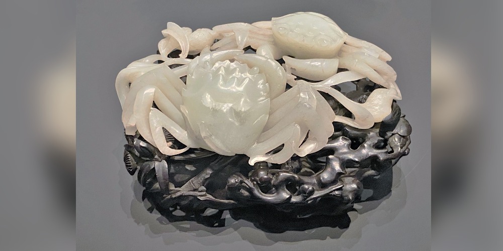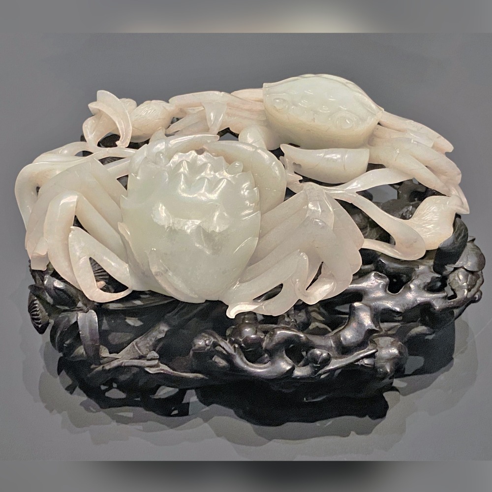 以白玉圓雕相對的二蟹,雙鰲各夾持蘆花、蘆穗一枝。這對文玩以二蟹及蘆花諧音「二甲傳臚」,意寓科舉及第。