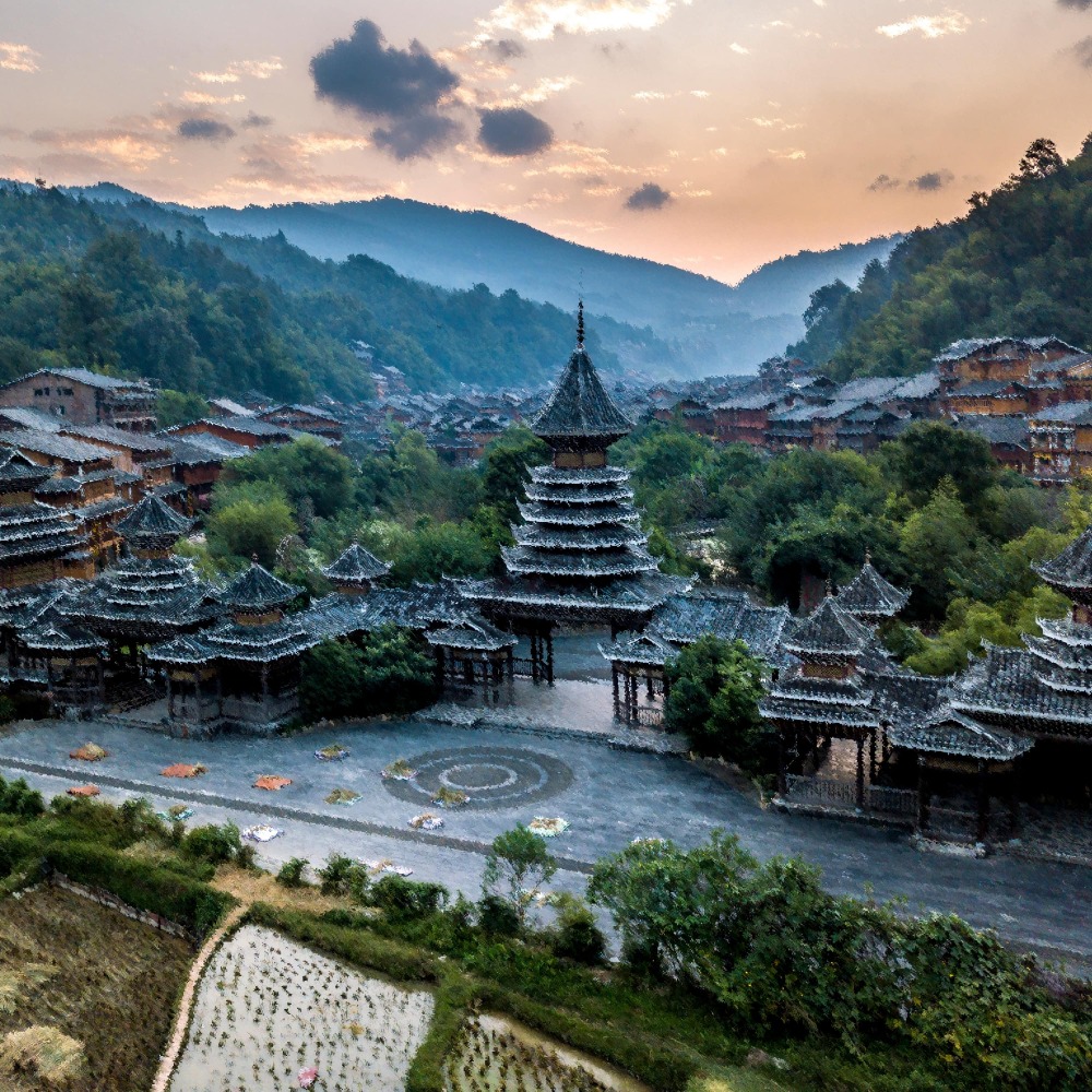 鼓樓是侗寨的標誌性建築,外形猶如一座大寶塔,形式分為歇山式(俗稱屋頂形)和攢尖頂式(俗稱傘頂或尖頂),通體為木質結構,以榫卯結構銜接,過程中不使用一釘一鉚,可保持百年不腐不倒,展現出侗族人高超的建築技藝。