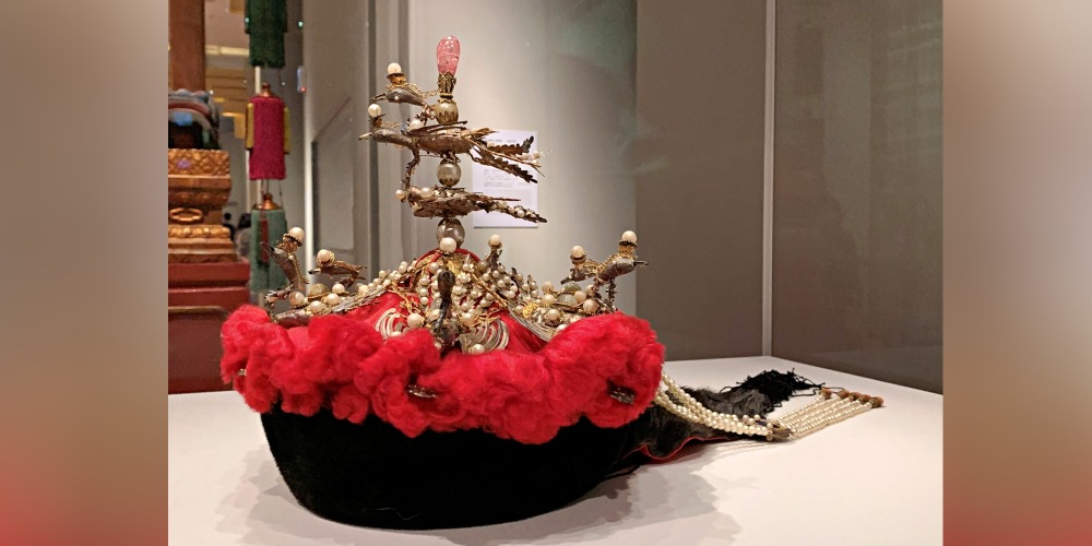 此冠為圓形卷簷式,頂綴紅絨,沿鑲黑色薰貂皮,裏襯紅布。冠頂正中銅鍍金累絲頂子分2層,每層鳳1隻,各承托大珍珠1顆,冠頂端飾粉紅碧璽1顆。