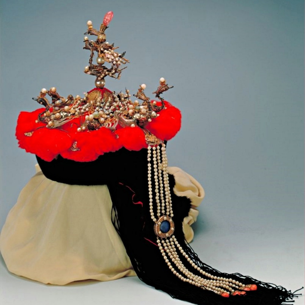 從頂子和鳳的數目來看,這應是皇帝的妃子冬季戴的朝冠,但是「五行二就」的形式卻是皇后或皇太后朝冠所享用的等級標誌。