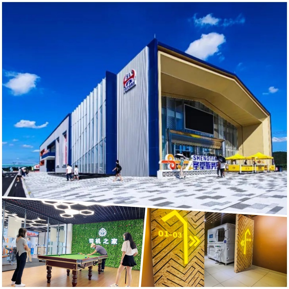 這裏設有24小時加油站,雙邊加油站10個雙柱加油島共有20條加油通道,能夠讓52台車同時加油。加油站還為重型貨車專門配備了10把大流量柴油槍、加油速度為每分鐘80升,較標準加油槍快60%