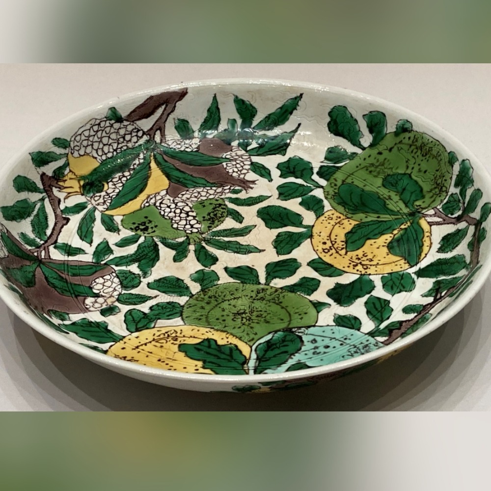 此盤釉下刻雲龍紋,再用黃、綠和紫彩描繪各種折枝果實,當中的石榴蘊含多子寓意。此類不含紅彩的三種低溫釉彩一般被稱為「素三彩」,屬明代首創而盛行於清代康熙朝。