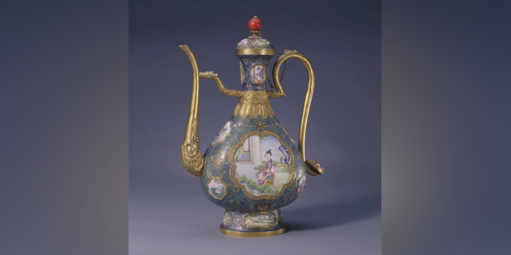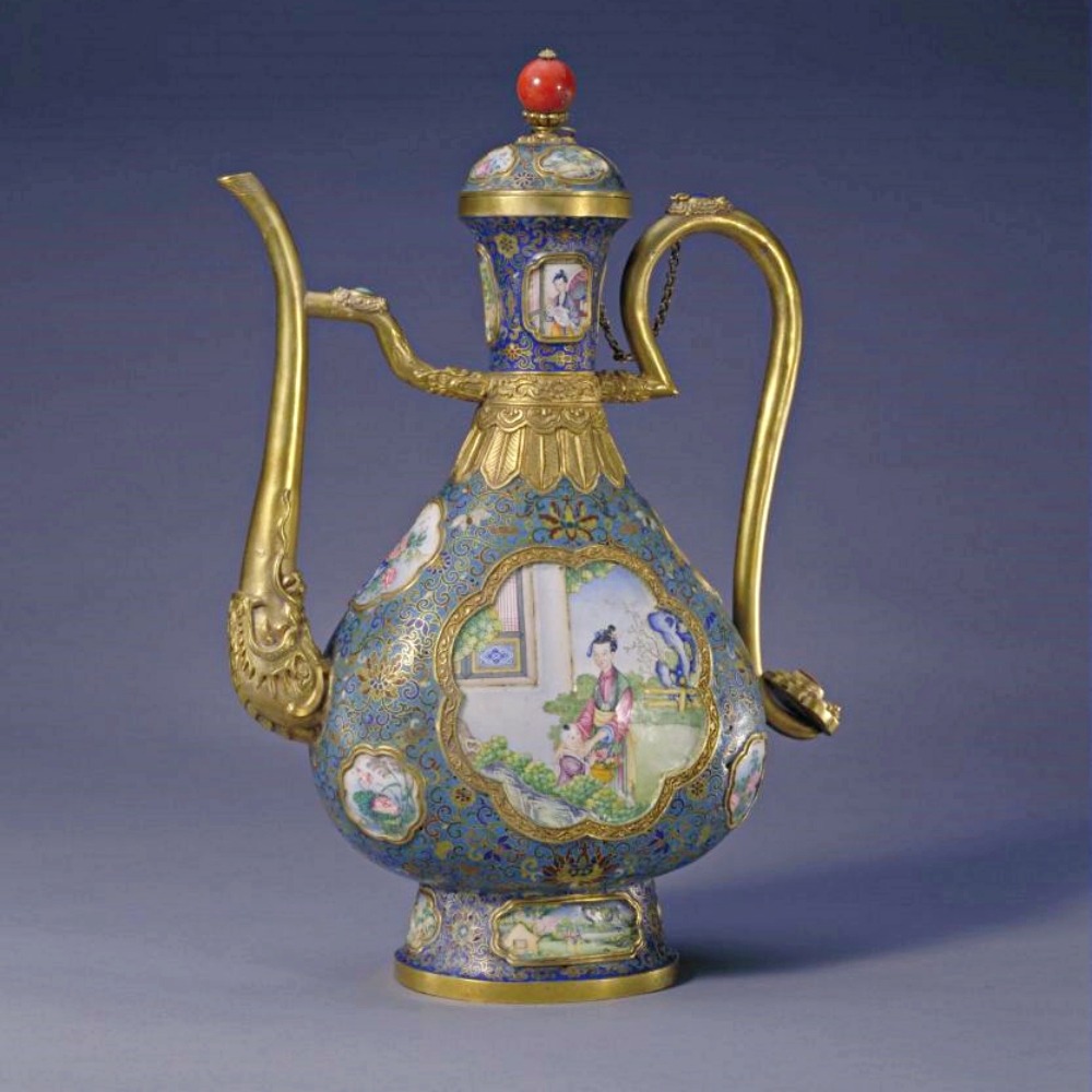 琺瑯器以銅胎居多,金胎少見。此壺造型沿用明代金執壺樣式,開光內圖案雖作中國人物、景致,卻雜糅了歐洲繪畫的表現技法,是一件中西合璧的皇家藝術珍品。