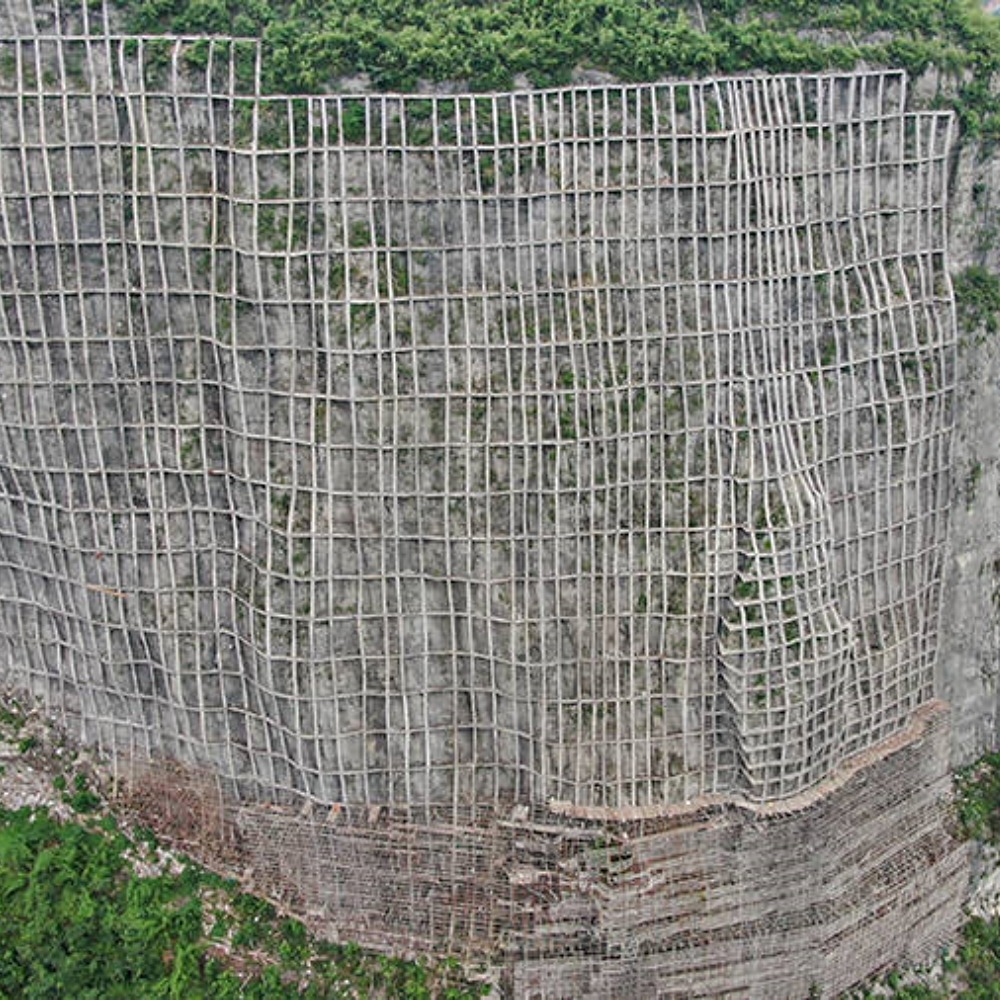 *被動防護網:由鋼絲繩網、環形網、固定系統、減壓環和鋼柱四個主要部分構成,阻止崩塌岩石土體的下墜,起到邊坡防護作用。