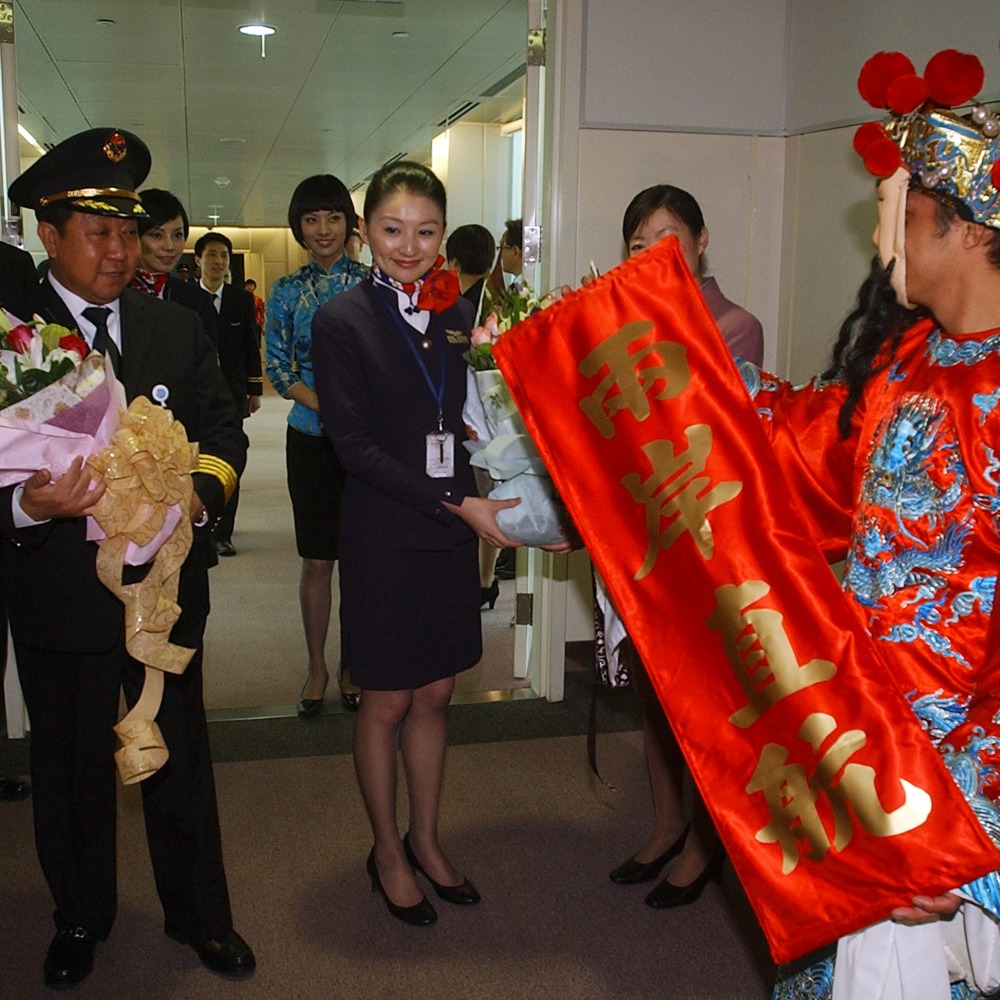 當天,台灣復興航空第一班GE332號客機從台北松山「截彎取直」飛往上海。另一方面,深圳航空ZH9095號班機則是第一班降落台灣的大陸常態包機,並在松山機場接受灑水祝賀。