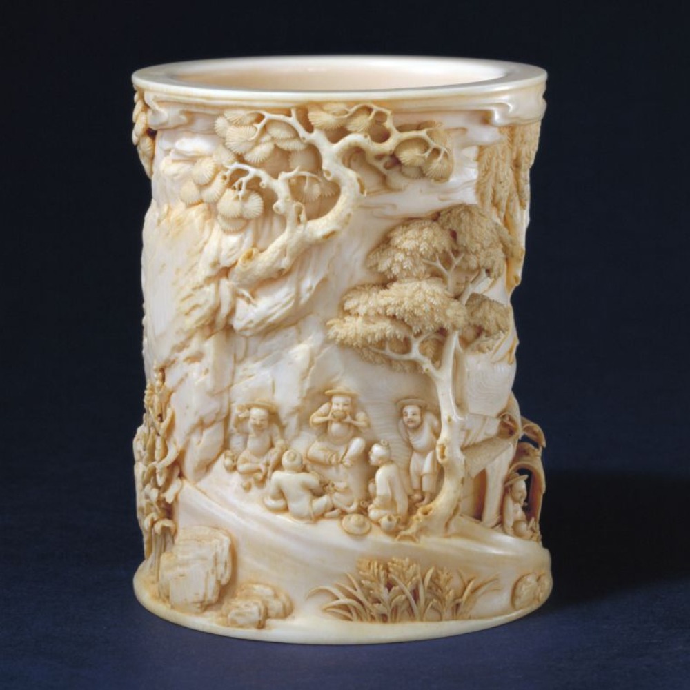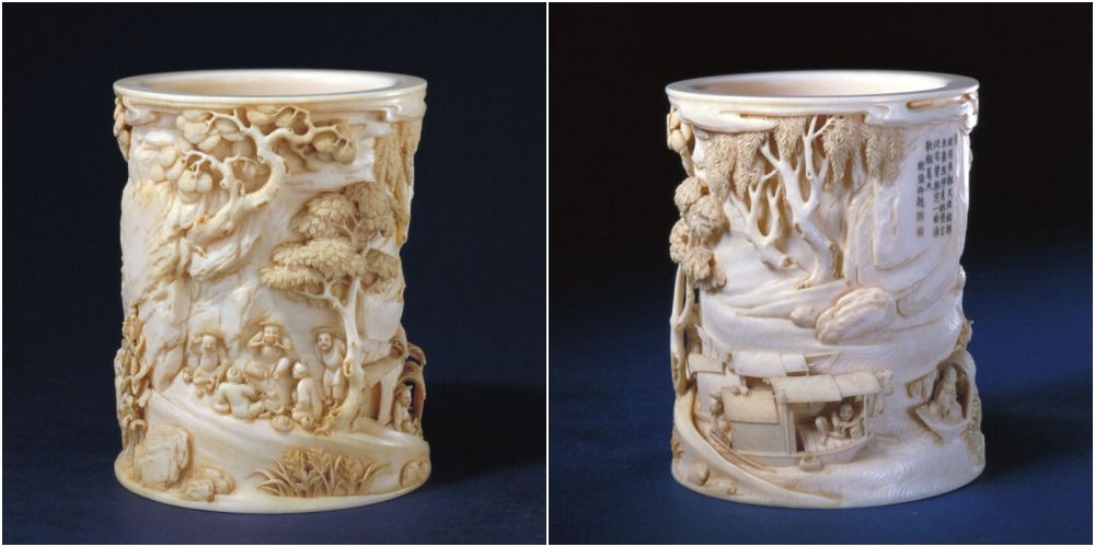 這件牙雕筆筒帶有蘇州、嘉定竹刻風格,浮雕深達6至7層,所刻景物細膩靈透,工細入微。人物的發、須、眼以墨點染,松葉如輪,松針纖細鮮明,都體現了黃振效雕刻技術的精湛,同時也表現了清代雕刻工藝頂峰時期牙雕藝術的獨特魅力。
