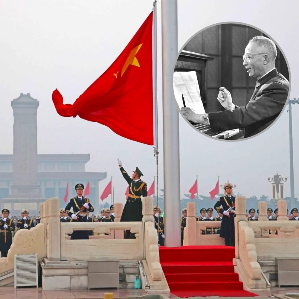 「看着天安門城樓上粉飾一新,正在掛大紅宮燈,底下正有一群少先隊員打着軍鼓,吹着軍號,我忽然腦子一動,從低到高,『五星紅旗迎風飄揚,勝利歌聲多麼響亮』就出來這個歌聲了。『歌唱我們親愛的祖國,從此走向繁榮富強』......」他說。
