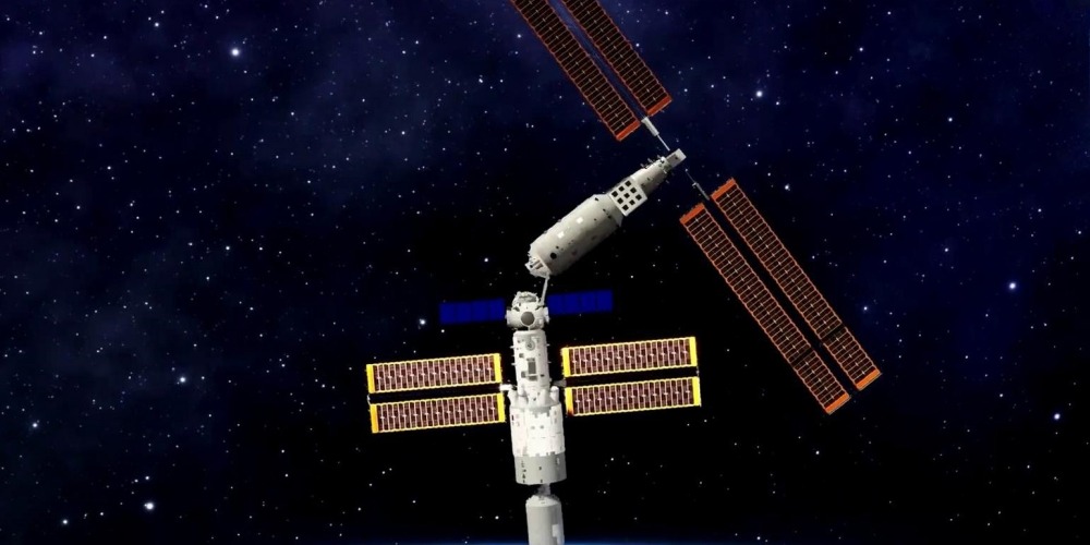 9月30日中午12時許,駐守「天宮」的太空人和地面人員經過1小時協同操作,問天實驗艙成功從前向對接口,平面轉位到節點艙側向對接口,太空站組合體變成「L」形。