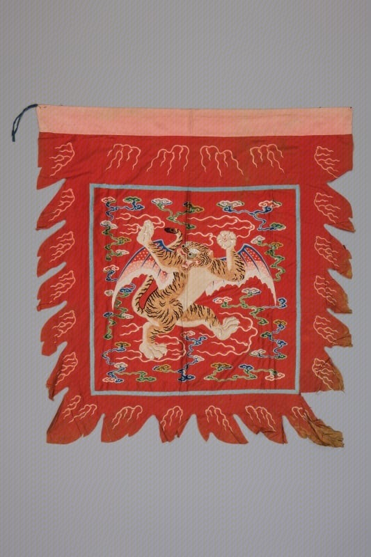 這面來自清朝的旗幟「紅色紗綉雲紋飛虎旗」,作為帝王、官員、軍隊的用旗,飛虎旗把老虎放進圖案之中,有「壯軍威」的作用。