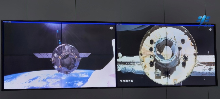 天舟五號是當天上午10時03分由長征七號火箭搭載升空,約10分鐘後船箭分離,準確進入預定軌道。中午12時10分,它與中國太空站的後向對接口對接。