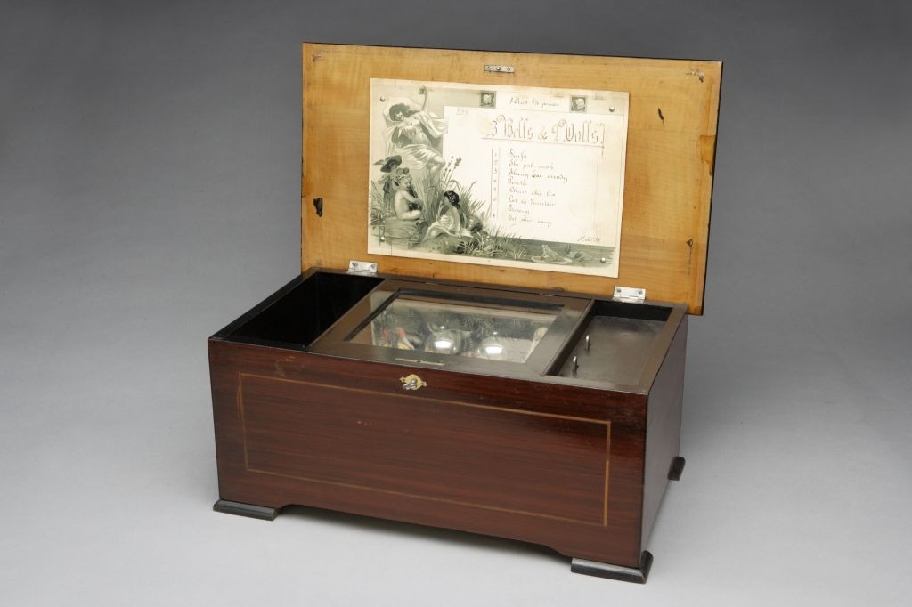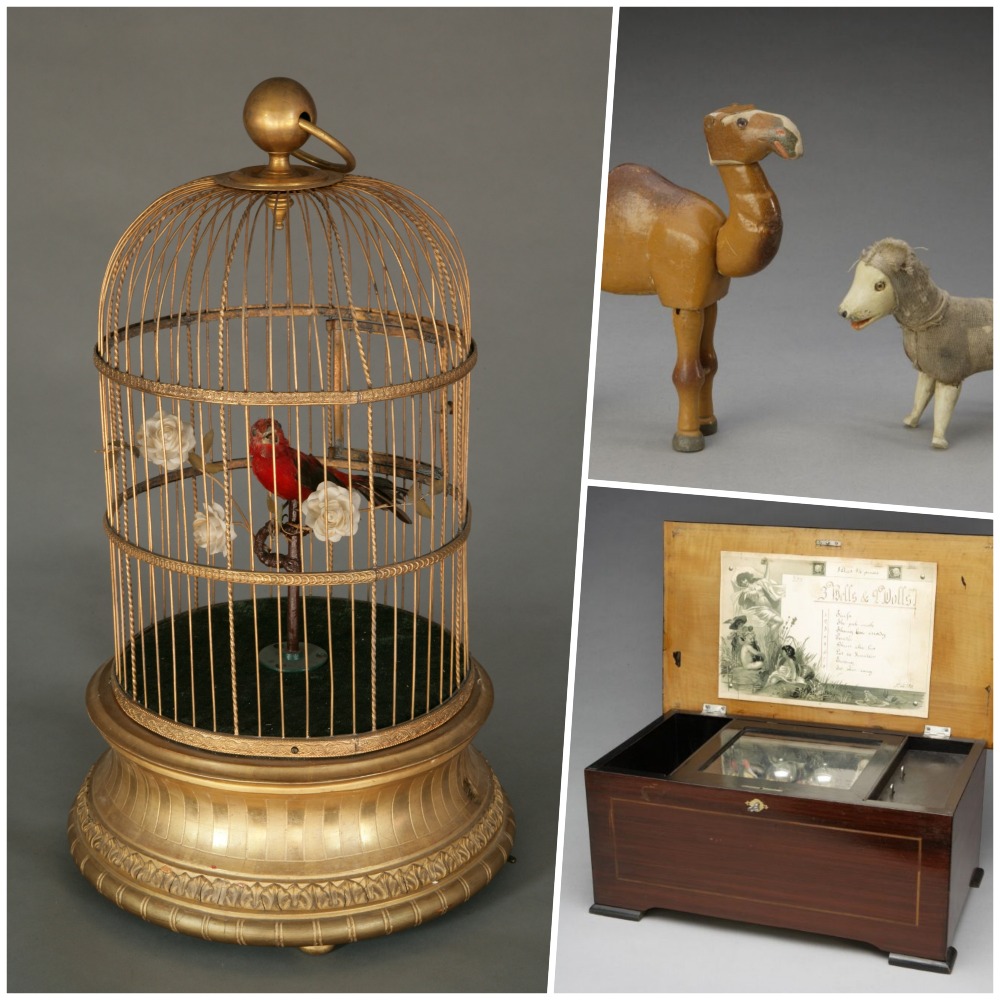 除此之外,還有一些會動會發聲的機械玩具。像是來自瑞士的「八音盒」,裏面就配置了能夠奏樂得滾筒,上弦後滾筒轉筒,就能播放出美妙動人的音樂了。