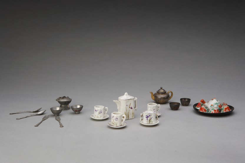 這套「扮家家酒的小玩意兒」,就像我們兒時喜歡玩的「煮飯仔」玩具,裏面分別有小瓷茶具、小銀酒具、錫製小火鍋等等,一整套應有盡有,非常精美。