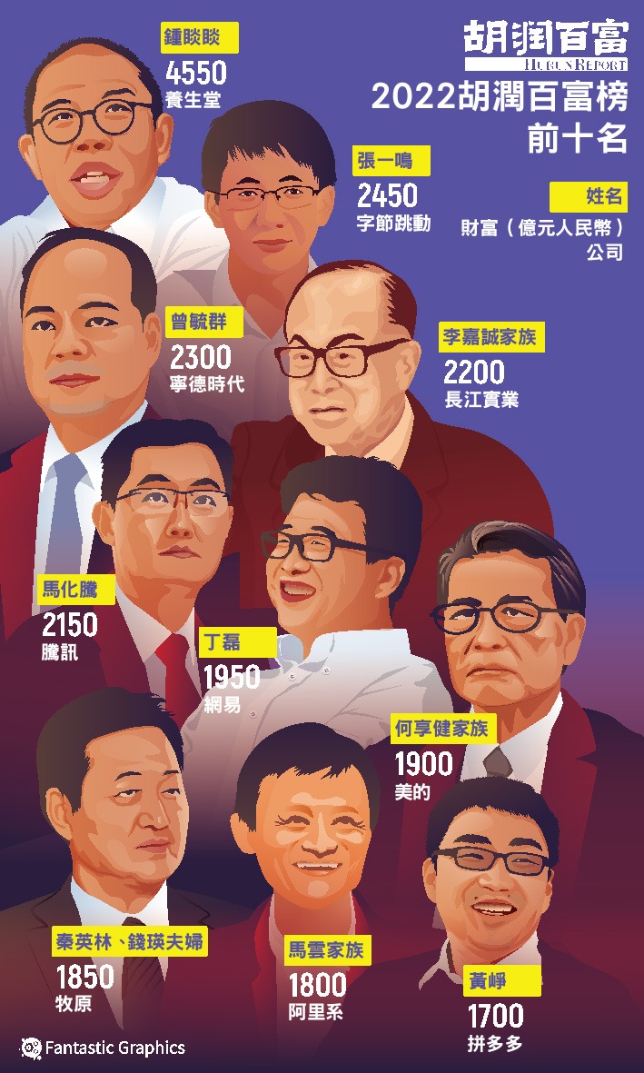 胡潤研究院11月8日發布《2022胡潤百富榜》,上榜企業家財富計算截止日期為今年9月15日。