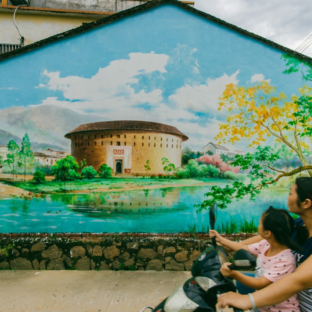 因為城市發展,這裏的年輕村民出外謀生,廢舊的村落失去了活力。後來有一班畫師在村內租住,閒時把村屋的外牆粉飾一番,一幅幅富有各種人生意義的壁畫就展現人前。畫師人數大約有20多位,有了口碑,他們便開始在村內每一處都揮動彩筆,給灰黑的牆壁和老舊的角落賦上全新的「生命」。
