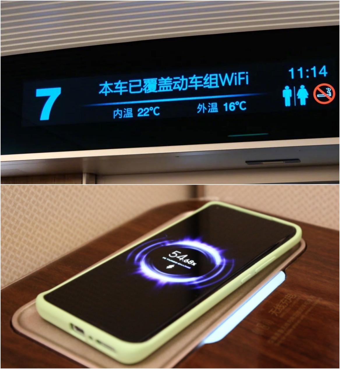 走進復興號智能動車組的車廂,可以說是科技感十足。商務座採用以「太極」為主題的魚骨式布局,座椅可实现「坐姿、半躺、平躺」三种姿态。商務座上配置的車載電視改為外置後,可透過手機投屏觀影,還能查詢列車運行位置、娛樂資源、天氣等服務,並增加了無線充電功能。