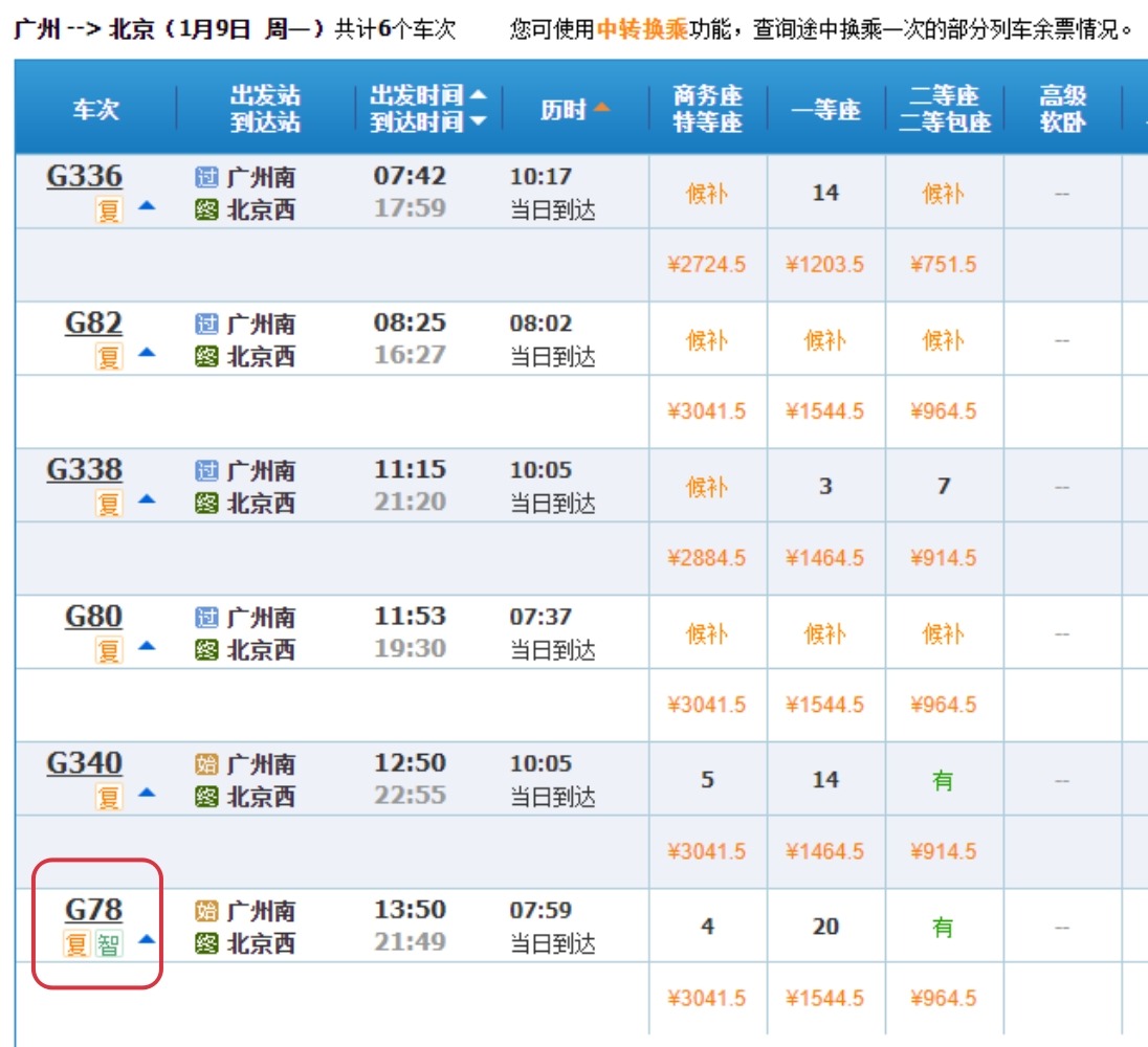 如在購票系統查詢1月9日廣州至北京的列車班次可知,G78車次為復興號智能動車組,始發站廣州南,終點站北京西,坐完全程約8小時。其中商務座(特等座)票價約3,041元人民幣,一等座和二等座票價分別約1,544元和964元人民幣。若車程同為8小時左右,選擇標準版的「復興號」票價亦相同。