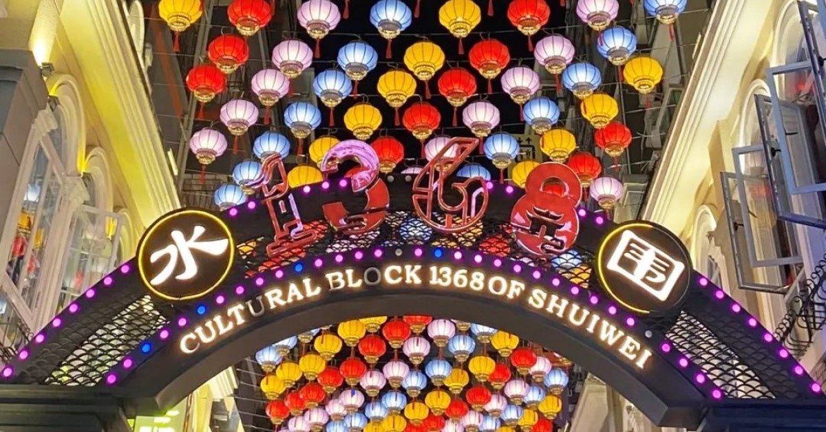 在落馬洲站下車過關後,到福田口岸站B出口步行幾分鐘,抬頭看到一排整齊雅緻的七彩紙燈籠,這裏便是福田的新蒲點「水圍1368文化街區」了。