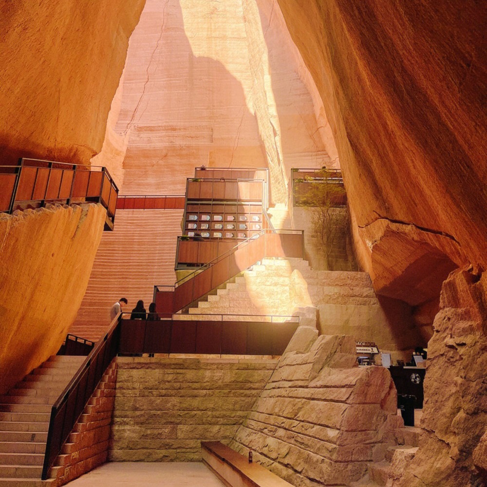 設計團隊保留了石宕中原本的石階,並將採石平台改造成一個個書房,放上書架及書桌等,成為一個天然的岩壁閲讀空間。人們可沉浸在石刻與書本的世界裏,沿着石梯走上層層曡曡的「書山」,仿佛攀登知識的山峰一樣,極具特色。