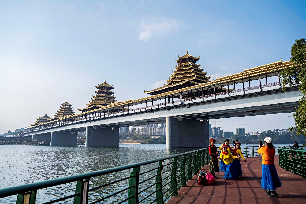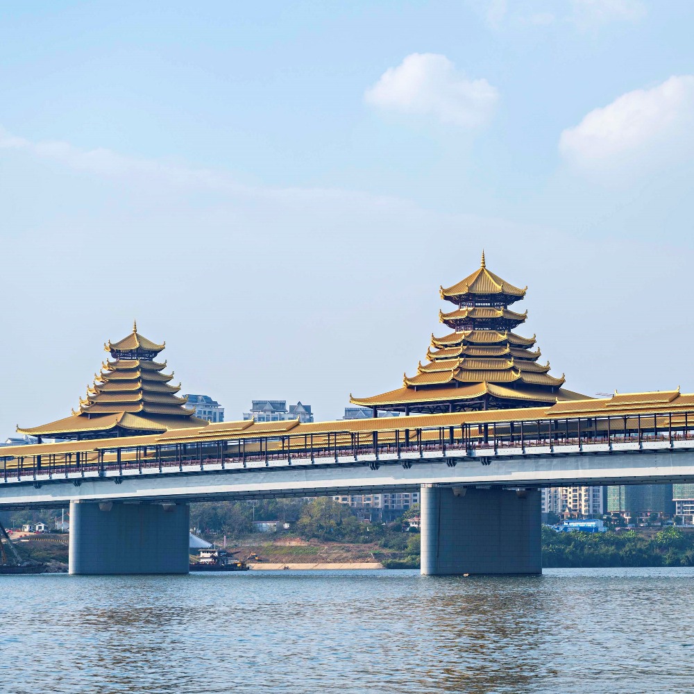何謂風雨橋?風雨橋是流行於廣西、貴州、湖南等地的侗族傳統建築,整體由橋、塔、亭組成。傳統的風雨橋主要用木料、石材搭建,橋面鋪板,兩旁設欄杆、長凳,橋頂蓋瓦,因為行人過往能躲避風雨,故名風雨橋。