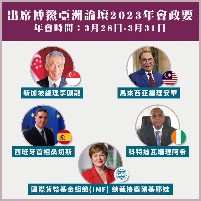 除了李顯龍之外,近期還有多位外國政要,會出席在海南舉行的博鰲亞洲論壇年會,包括馬來西亞總理安華、西班牙首相桑切斯、科特迪瓦總理阿希,以及國際貨幣基金組織(IMF)總裁格奧爾基耶娃。