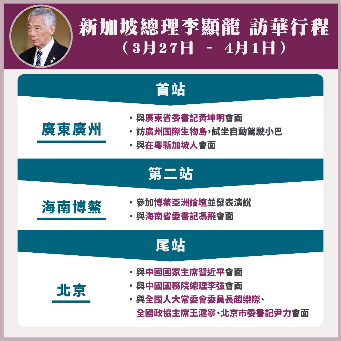 「打頭陣」的是新加坡總理李顯龍,他於3月27日至4月1日對中國進行正式訪問,期間到訪廣東廣州、海南博鰲和北京。