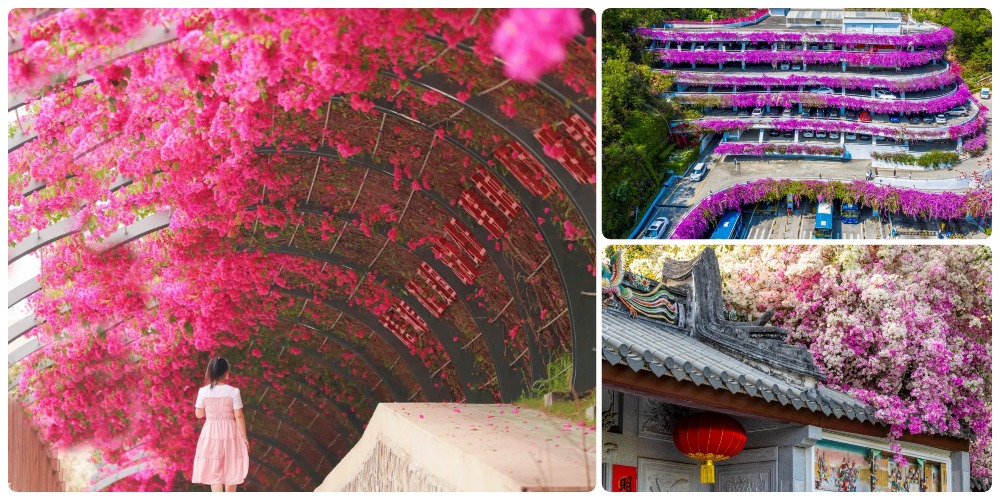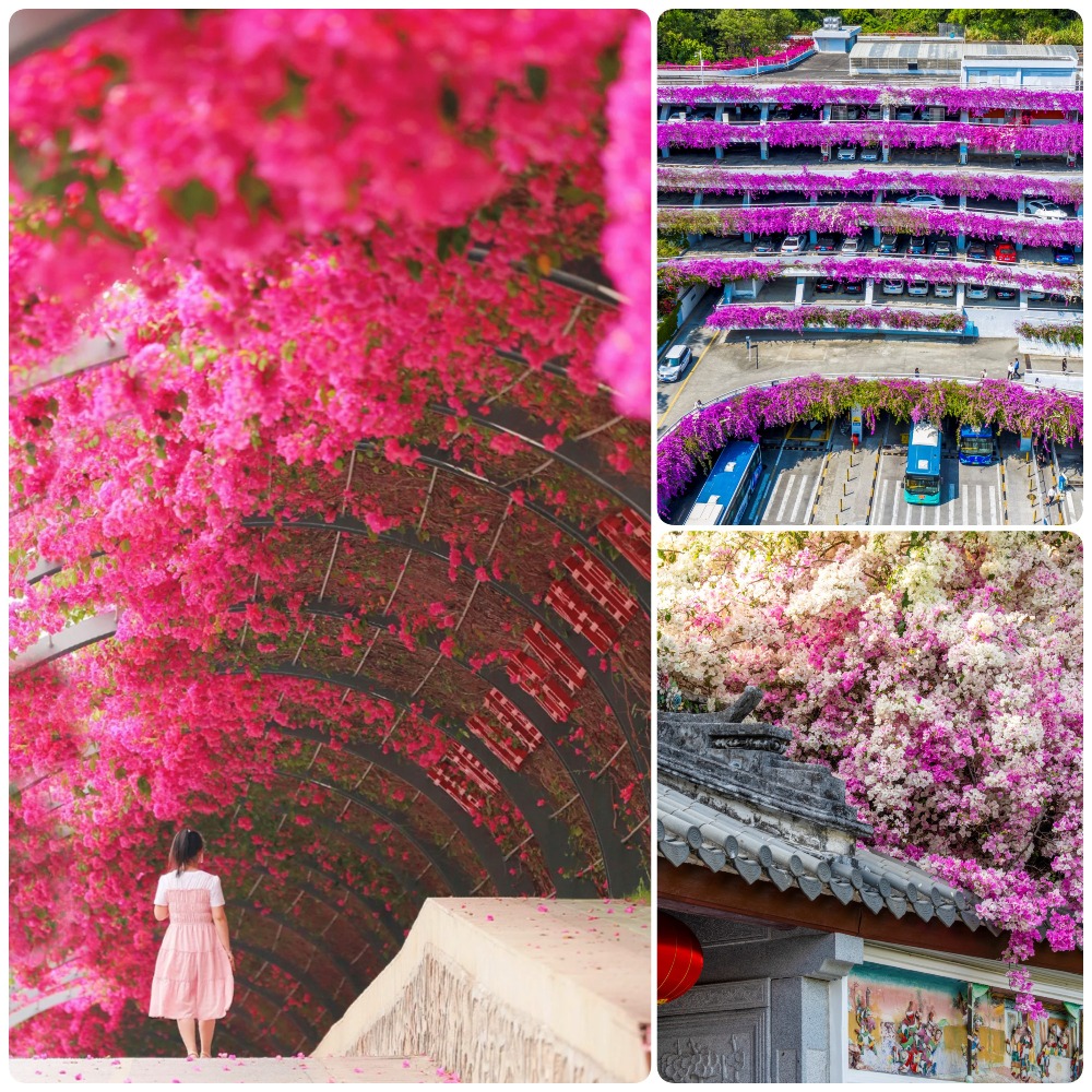 來到深圳園博園,紫紅的、粉紅的、白的、黃的編織成一片簕杜鵑花海,襯托古雅的園林風韻,走在當中彷彿踏進了花海世界。
