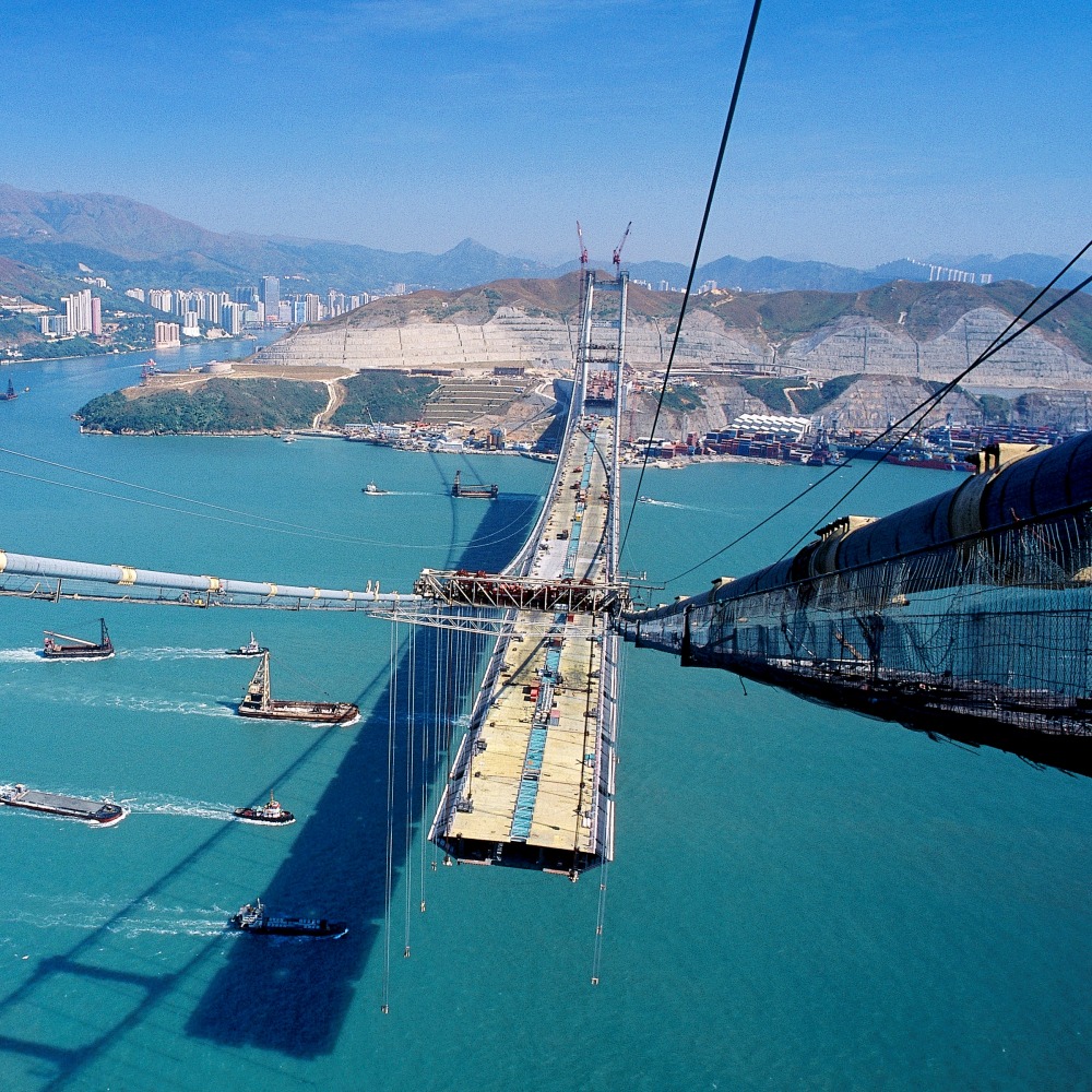 青馬大橋在1992年5月25日動工,耗資71.44億港元,是「玫瑰園」計劃(香港機場核心計劃)的一部分。大橋跨越馬灣海峽,連接巿區與位於大嶼山的香港國際機場,其主橋長1,377米,曾經是世界最長的鐵路公路兩用懸索橋。