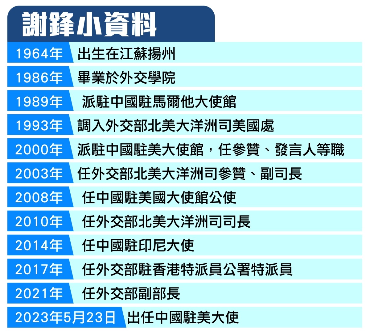 自秦剛今年1月回國出任外交部長後,中國駐美大使一職懸空超過4個月,是1979年中美關係正常化以來最長一次。有分析認為,謝鋒此際履新,或反映中美關係將解凍。